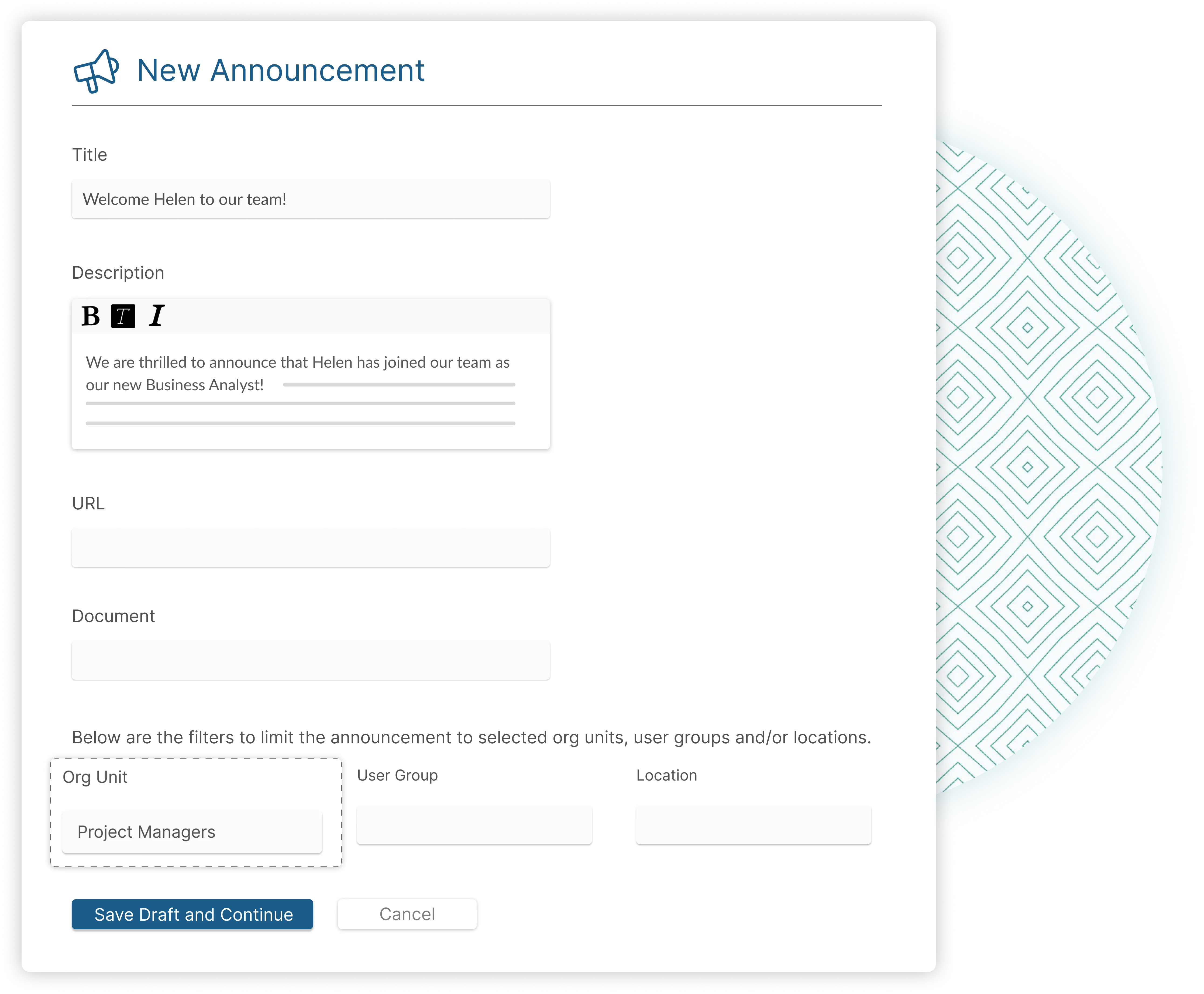 Grab viewers’ attention by personalizing it with images and URLs and documents to define the type of announcement that you would like to influence.