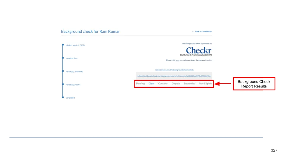 The status will change from Pending (Candidate) to Pending (Checkr) whenever the applicant completes and submits all the necessary background verification information. Pending (Checkr) indicates that the candidate's background check will now be conducted by the Checkr, and the status will remain pending until the Checkr has finished the background check process.