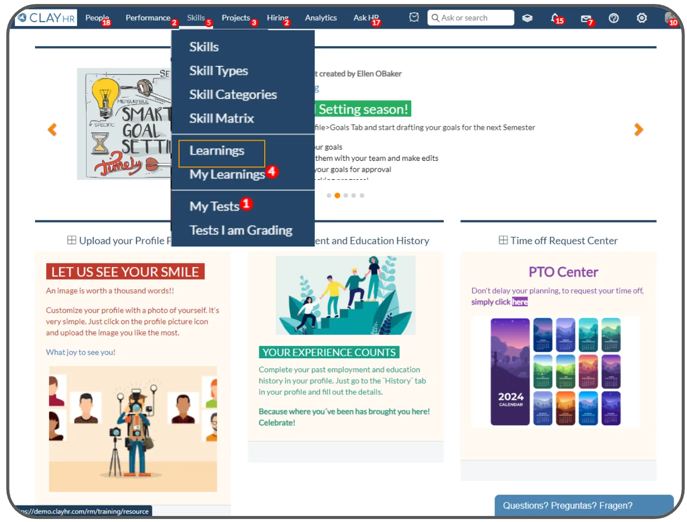 - Go to the “Skills” menu in the navigation bar and click on “Learnings”