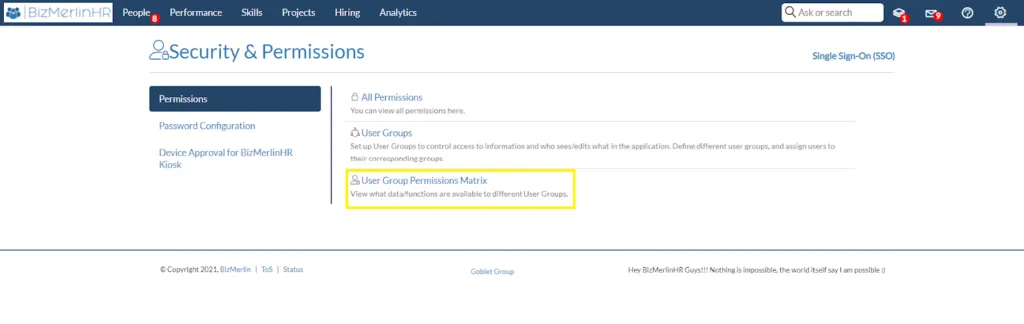 - Go to the Permissions section and click on “User Group Permission Matrix”.