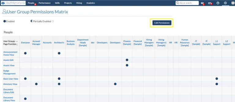 - The permission matrix is available here. Change permissions by going to the upper right corner and clicking the “Edit Permissions” button.