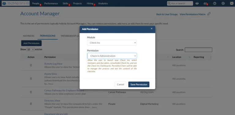 - The “Check-In Administration” permission has been successfully added to the “Account Manager” user group, as shown in the image below.