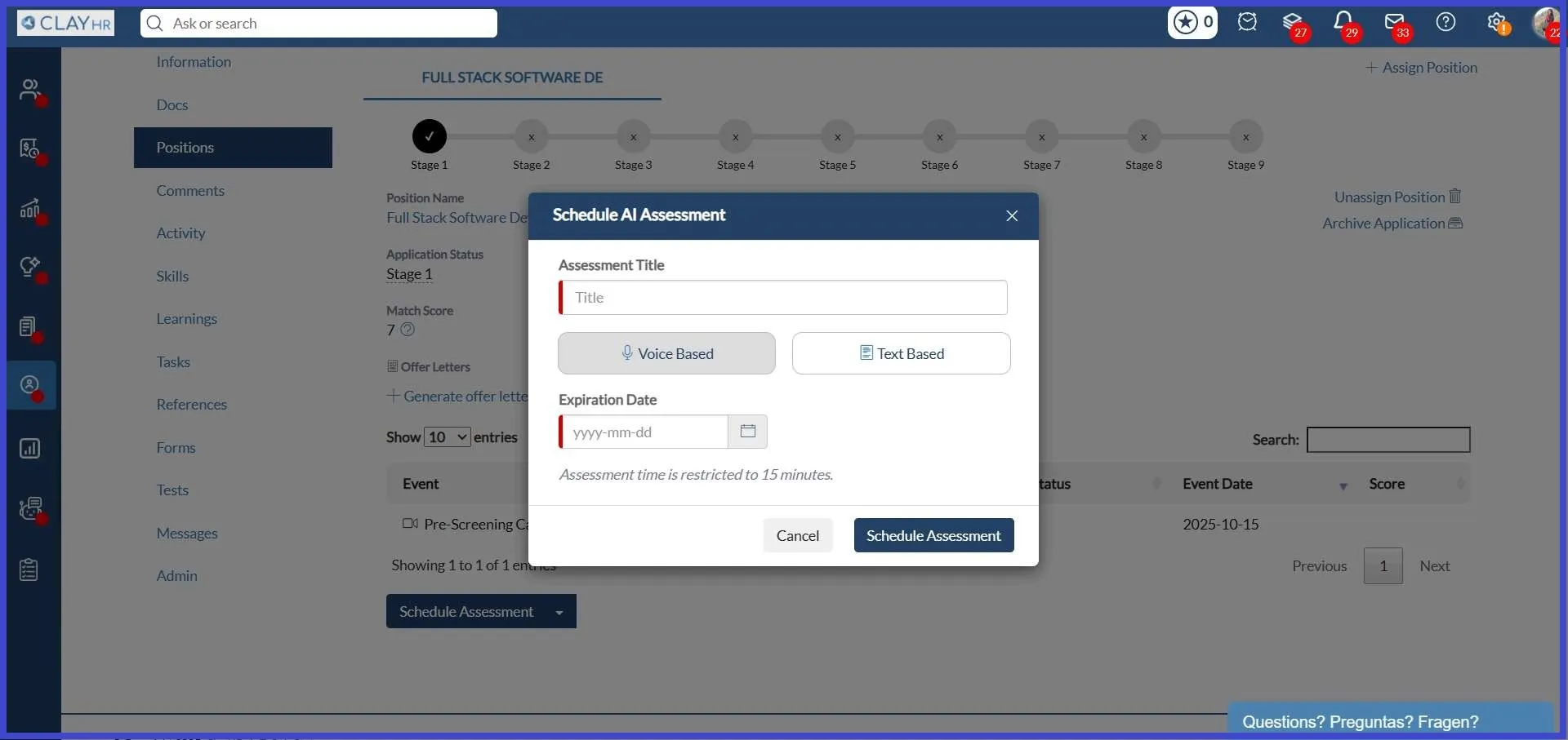 - In the pop-up, enter the assessment title, choose Voice or Text, and set the expiration date.