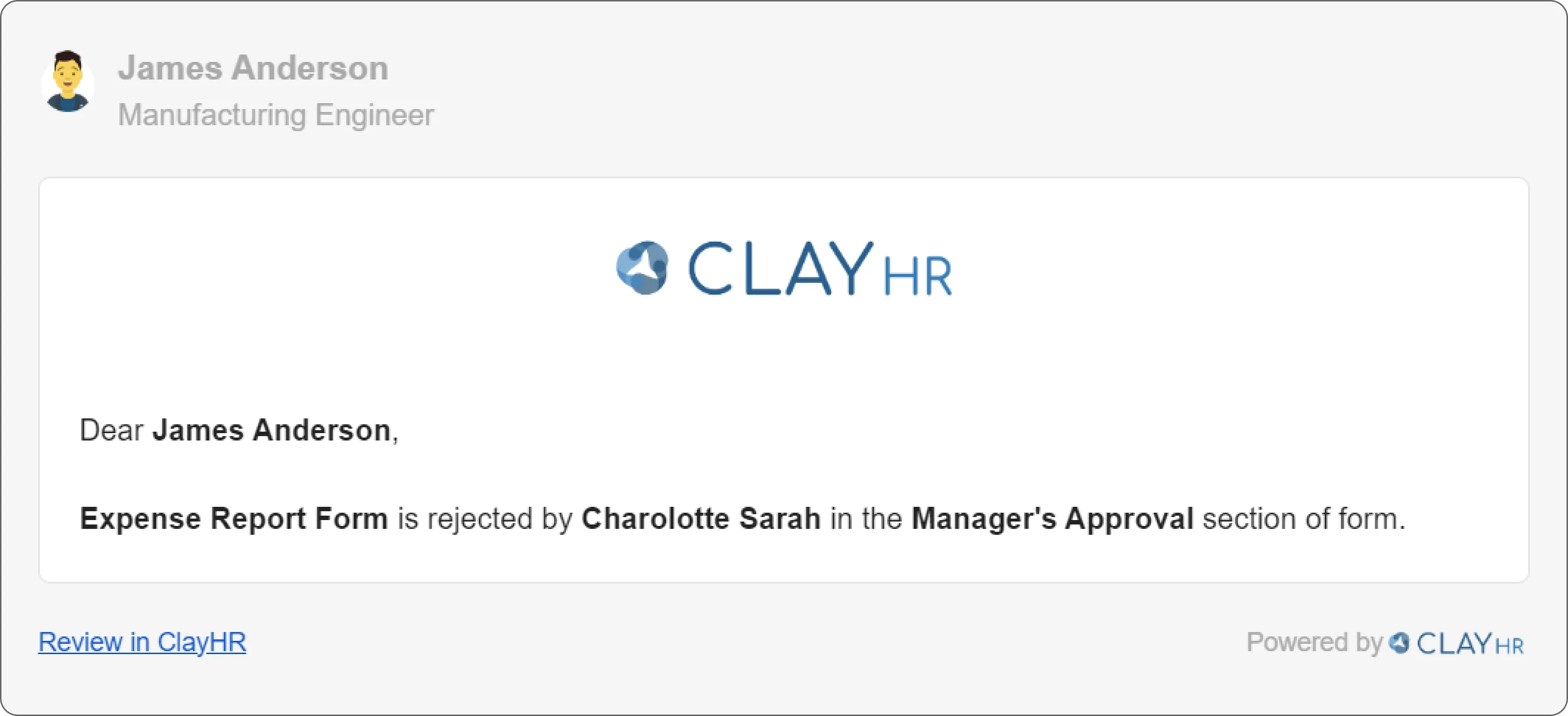 - Upon rejecting the form, an email notification will be sent to the user regarding the form rejection.