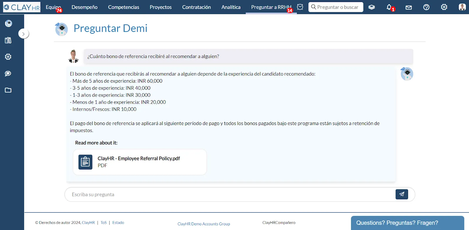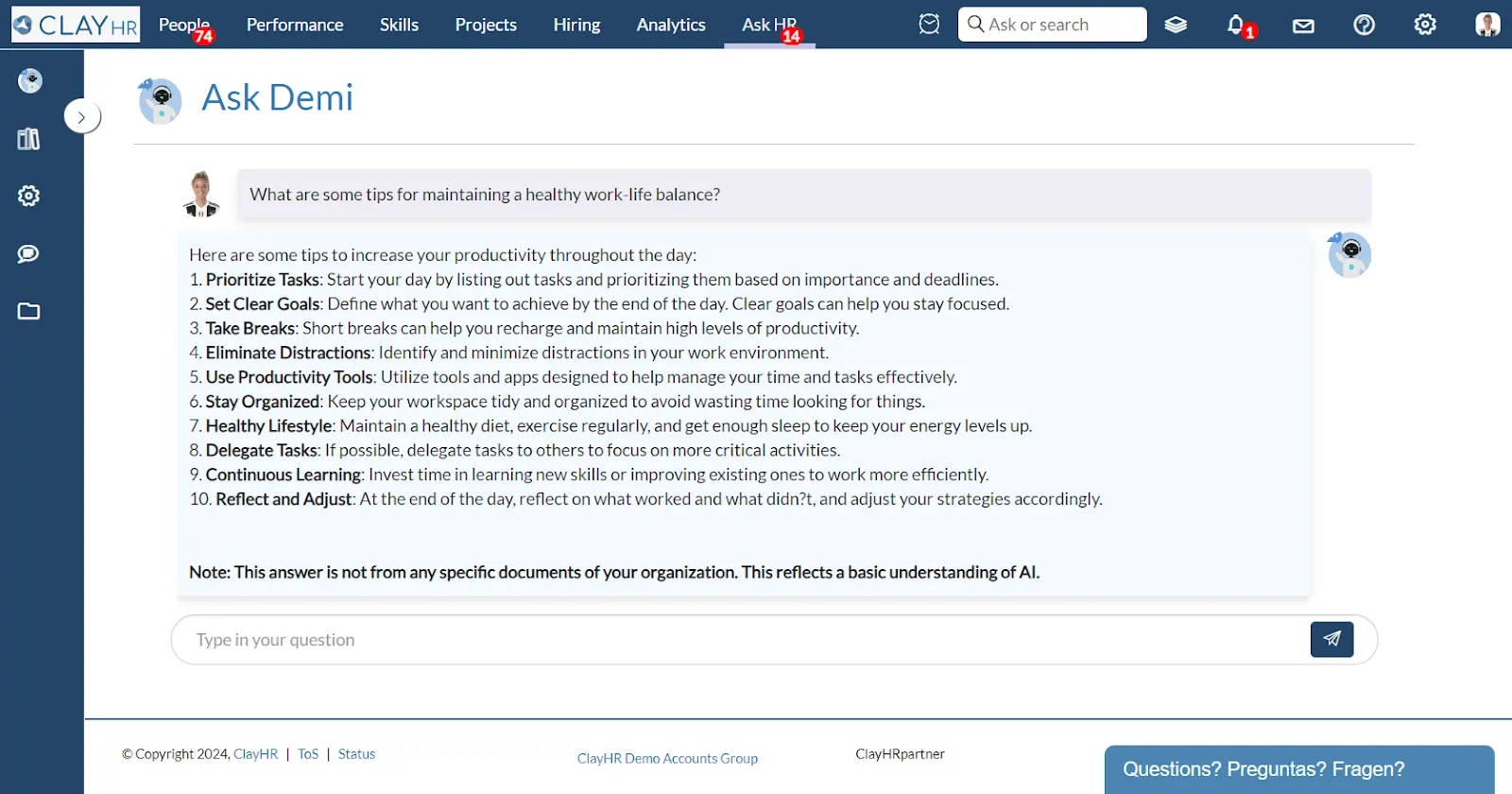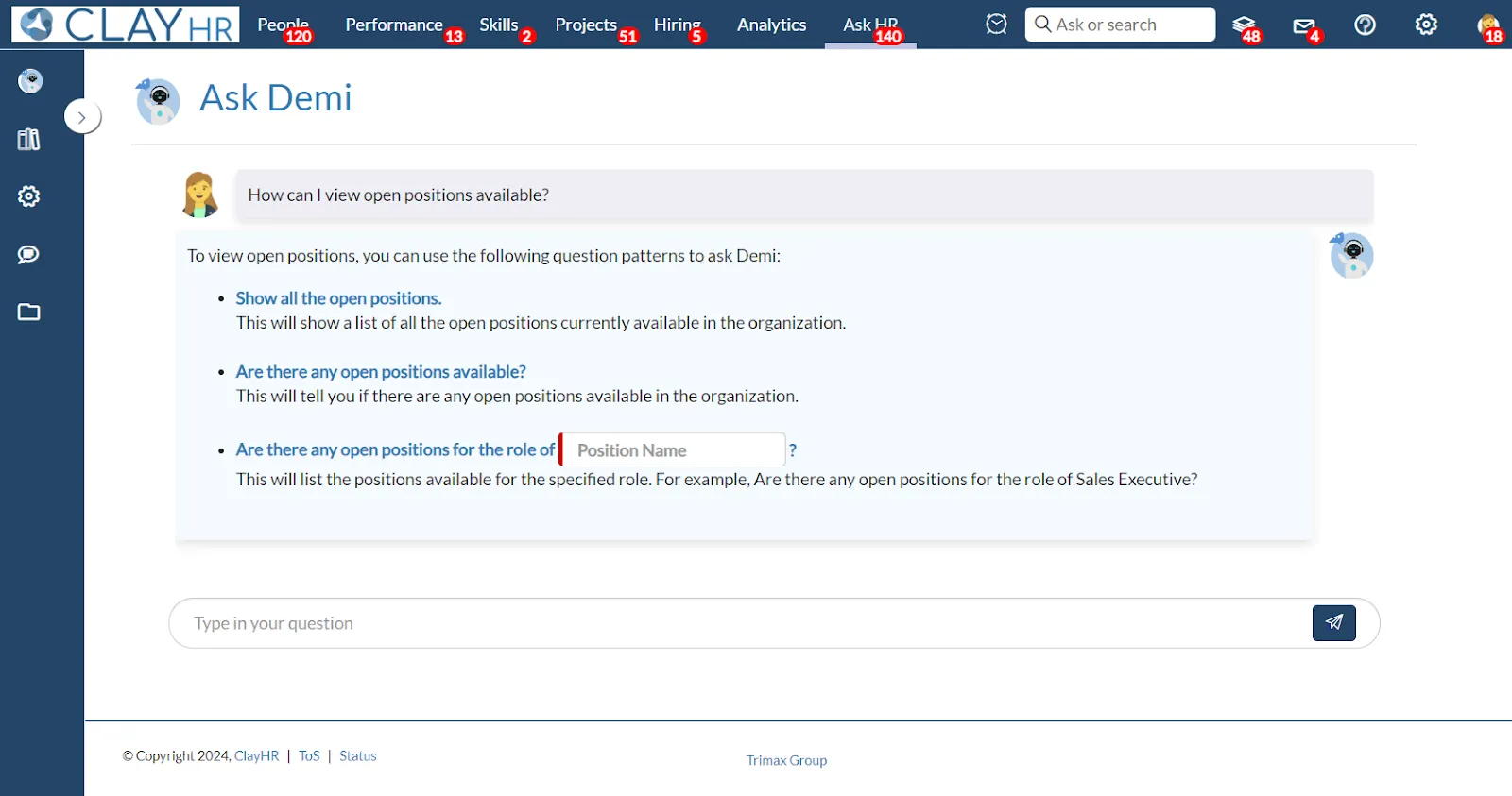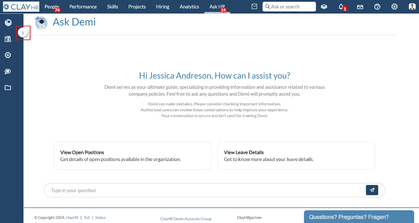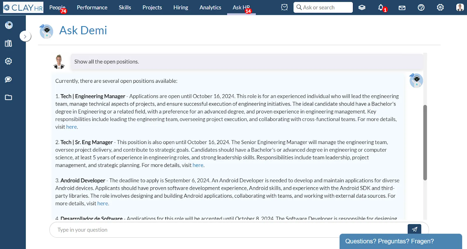 - On the Ask Demi page, there are two buttons that offer suggestions on how to ask your questions about open positions and leave details. You can either type your question or click on one of the suggested questions, and Demi will provide a response. Make sure to fill in any required inputs if present. Here are two scenarios: