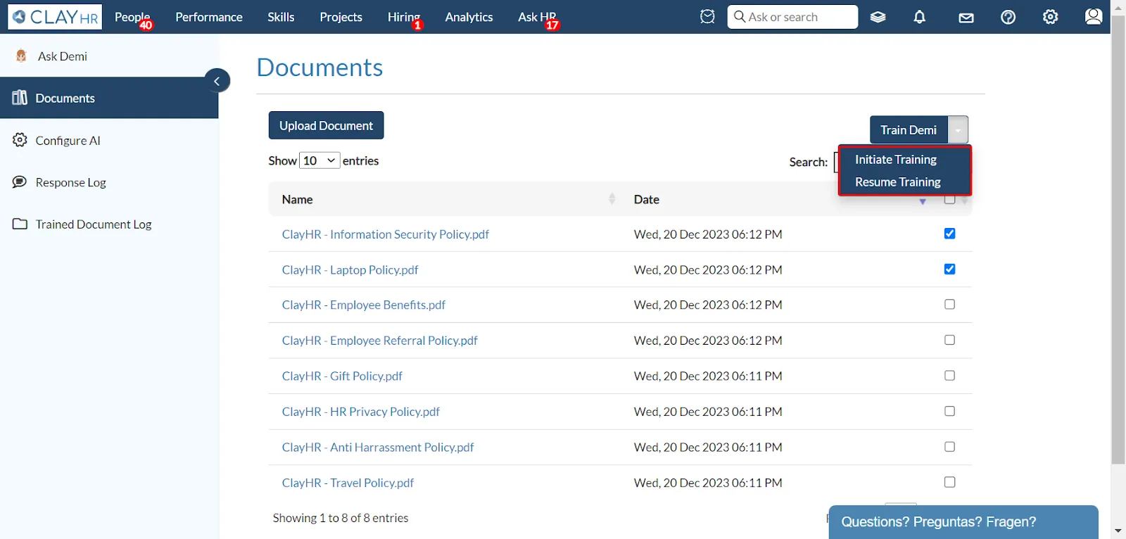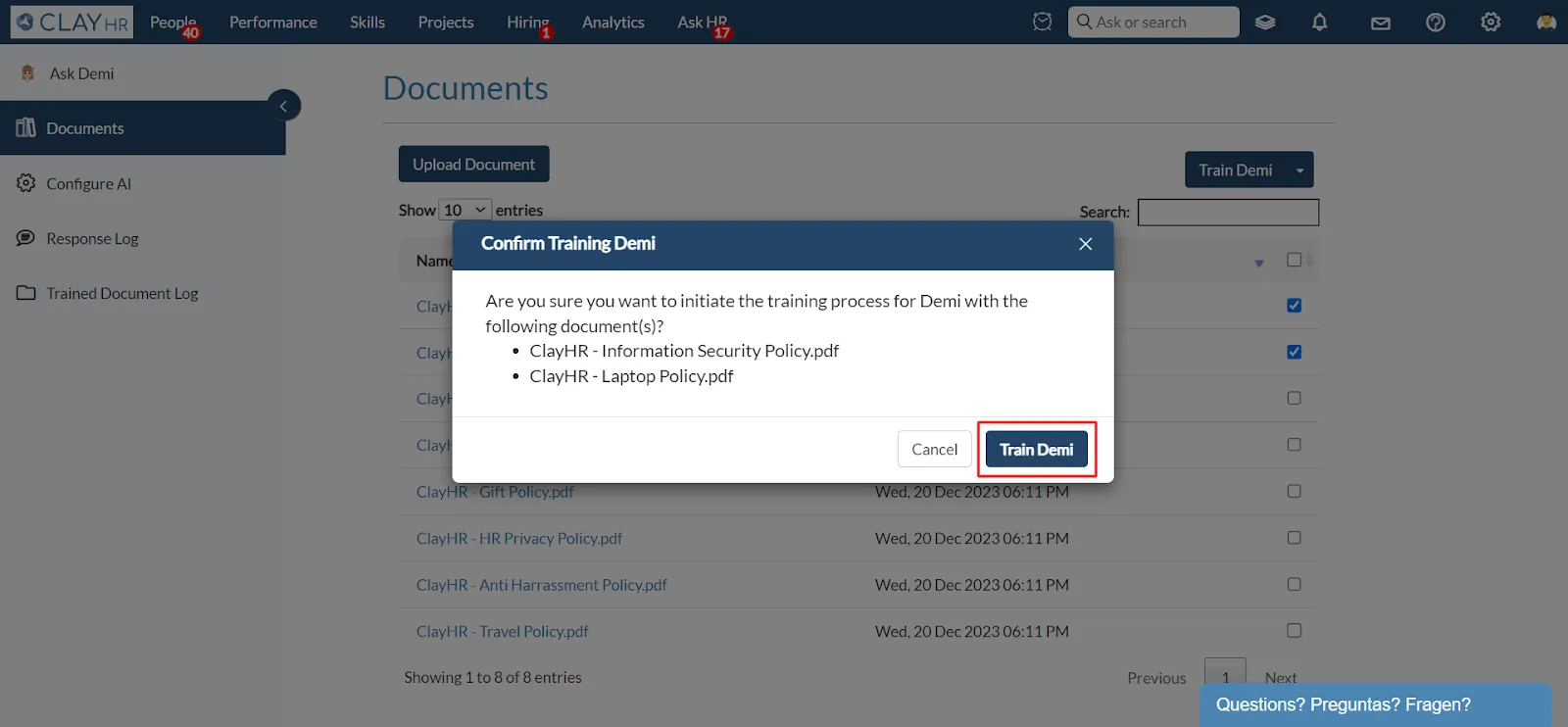 - To train the AI Assistant with documents, select the documents and click the dropdown icon next to “Train Demi”.