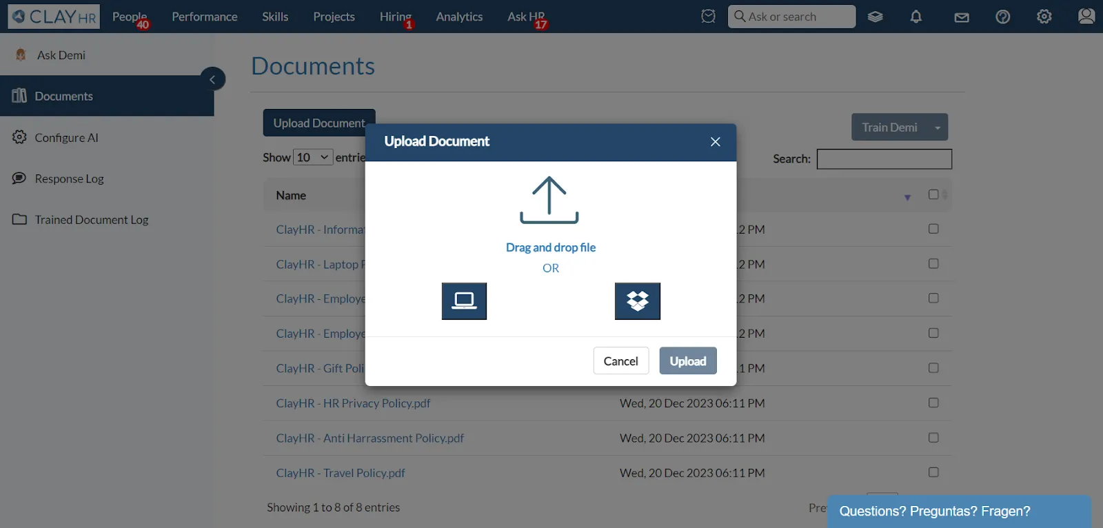 Ask HR provides employees with instant access to answers for HR-related inquiries. By training your AI Assistant with your company documents, including uploading policies to handbooks, employees can easily ask questions and receive quick, accurate responses. This saves time for the HR team by reducing repetitive inquiries and allows them to focus on strategic initiatives.