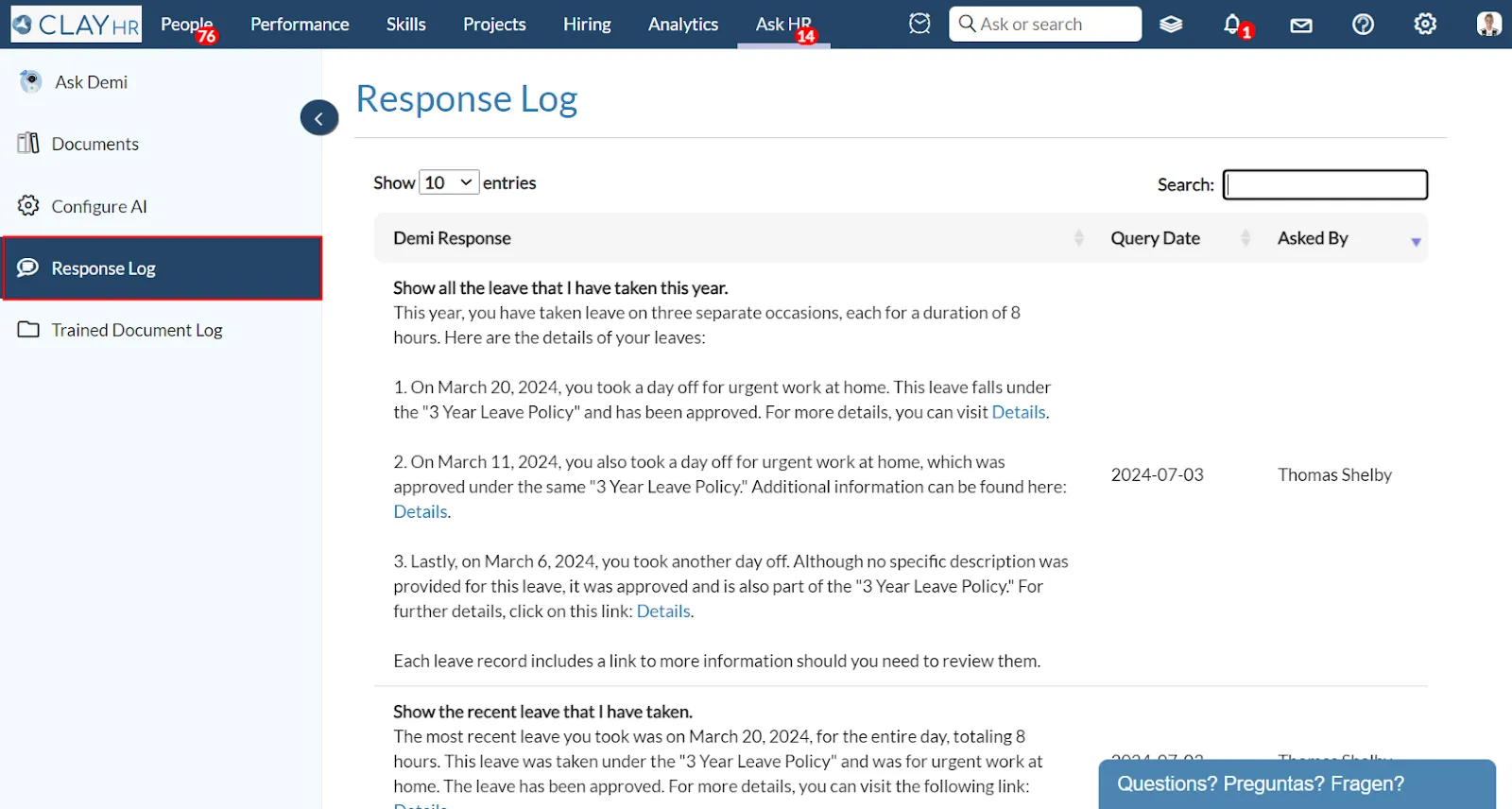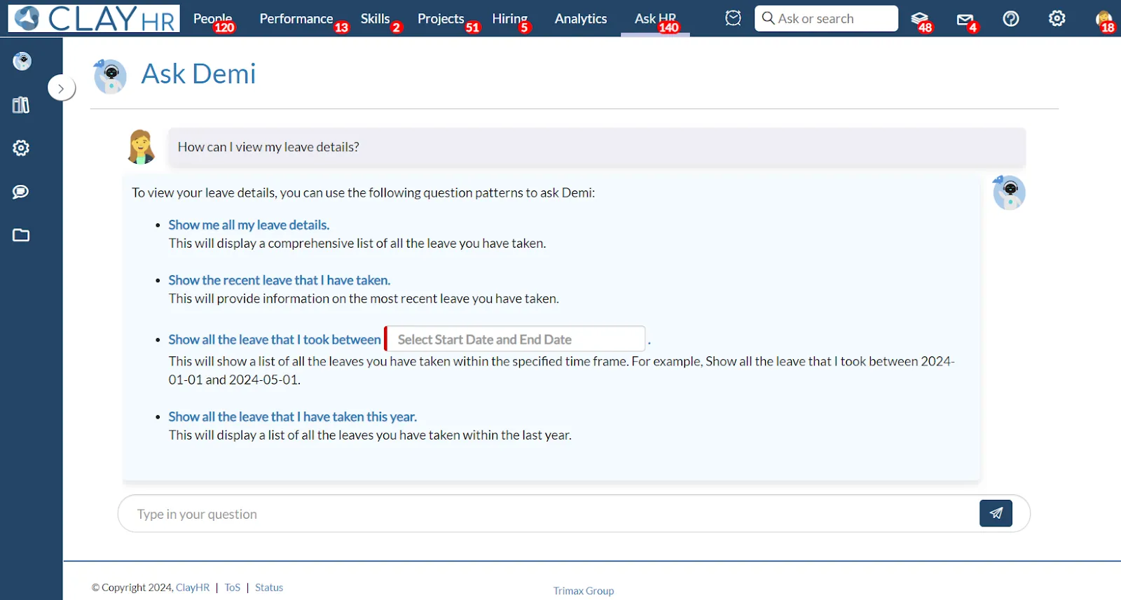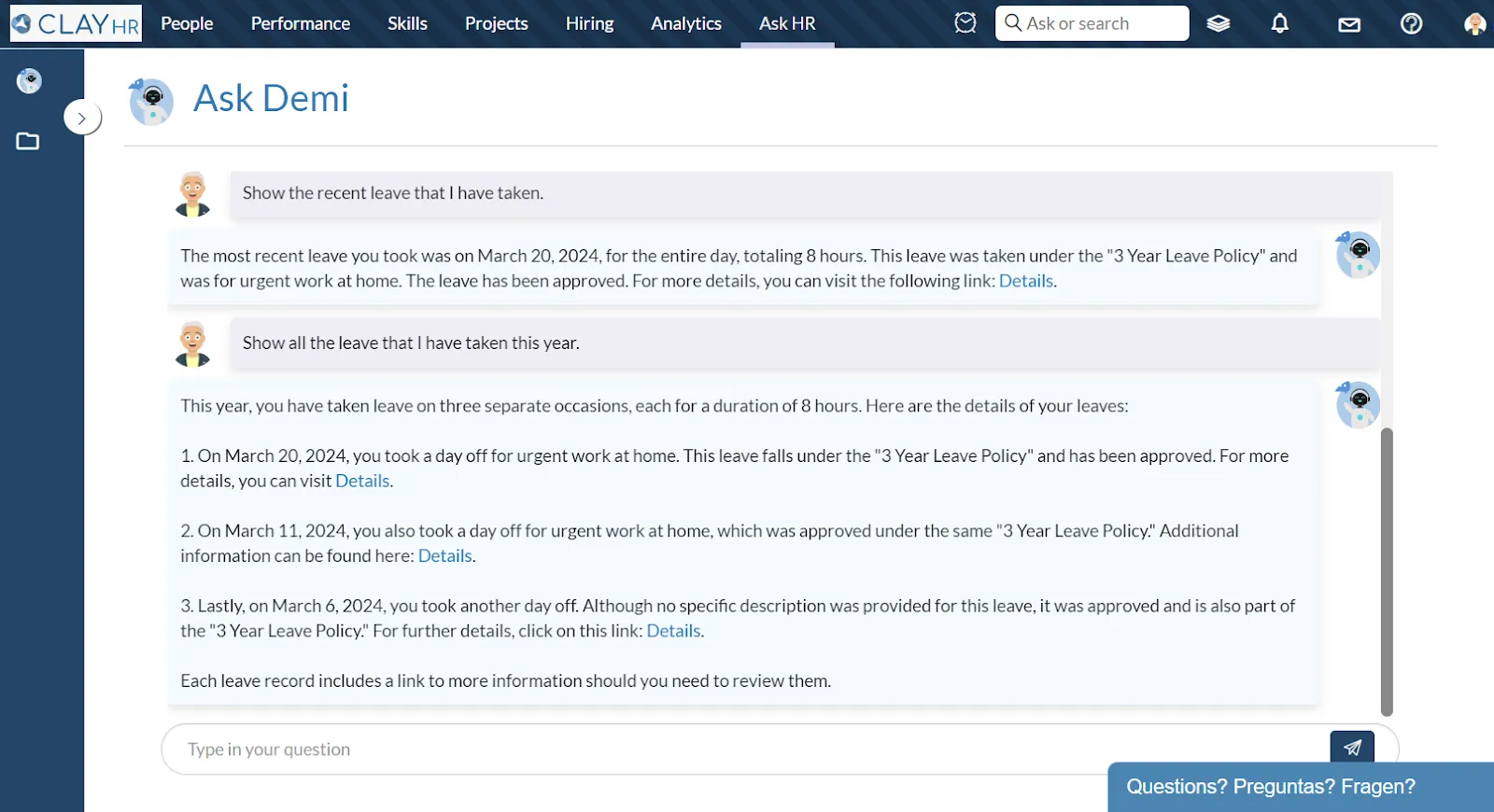 - Check Your Leave Details: Just ask about your leave records, and Demi will quickly retrieve details about your leave requests, including dates, policies, and essential information about your taken leaves.