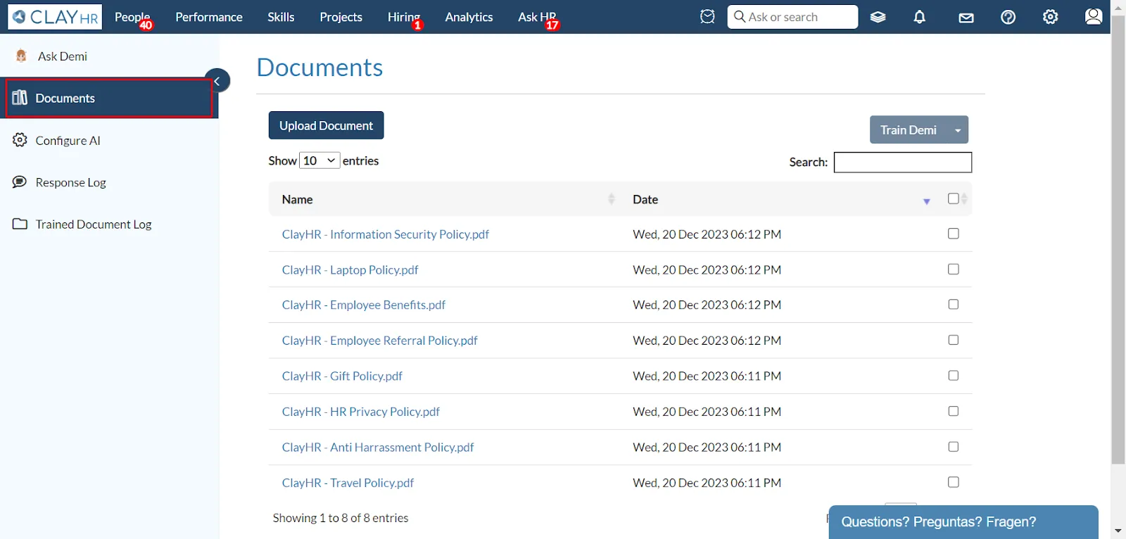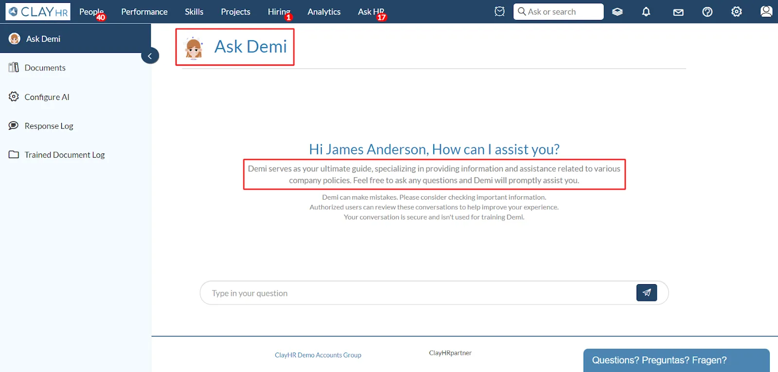 - Navigate to the “Ask HR” menu in the navigation bar and click on “Ask [AI Name]”. Users can personalize the “AI Name”. In this document, it is referred to as "Demi."