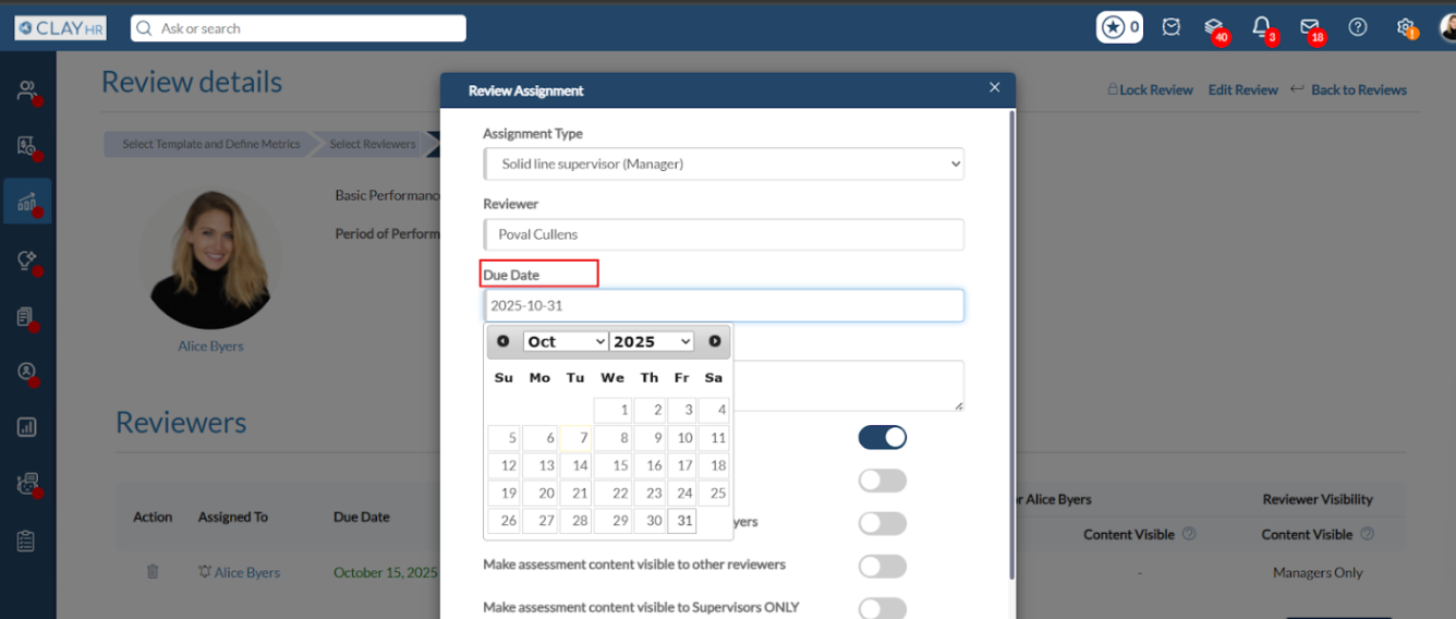ClayHR allows you to choose the number and type of reviewers for any particular performance review. Possible layers of assessment (“Assignment type”):