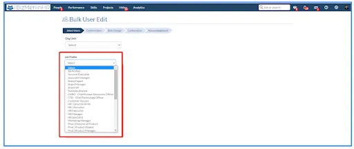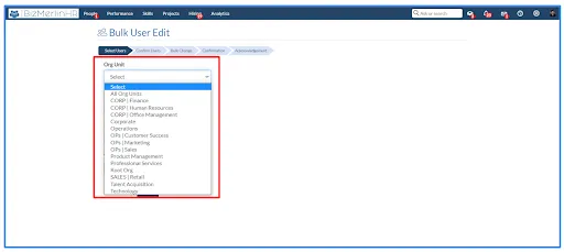 2. On the ‘Bulk User Edit’ page, one can sort the list of users based upon ‘Org Unit’, ‘Job Profile’, ‘Location’, and ‘Worker Type’ to perform bulk updates.