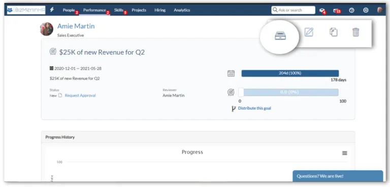 Archiving Goals will remove it from the “My Goals” list. Archived Goals will always be available in the “Archived Goals” sub-menu. To Archive a goal, go to the goal and click “Archive Goal” in the top-right menu.