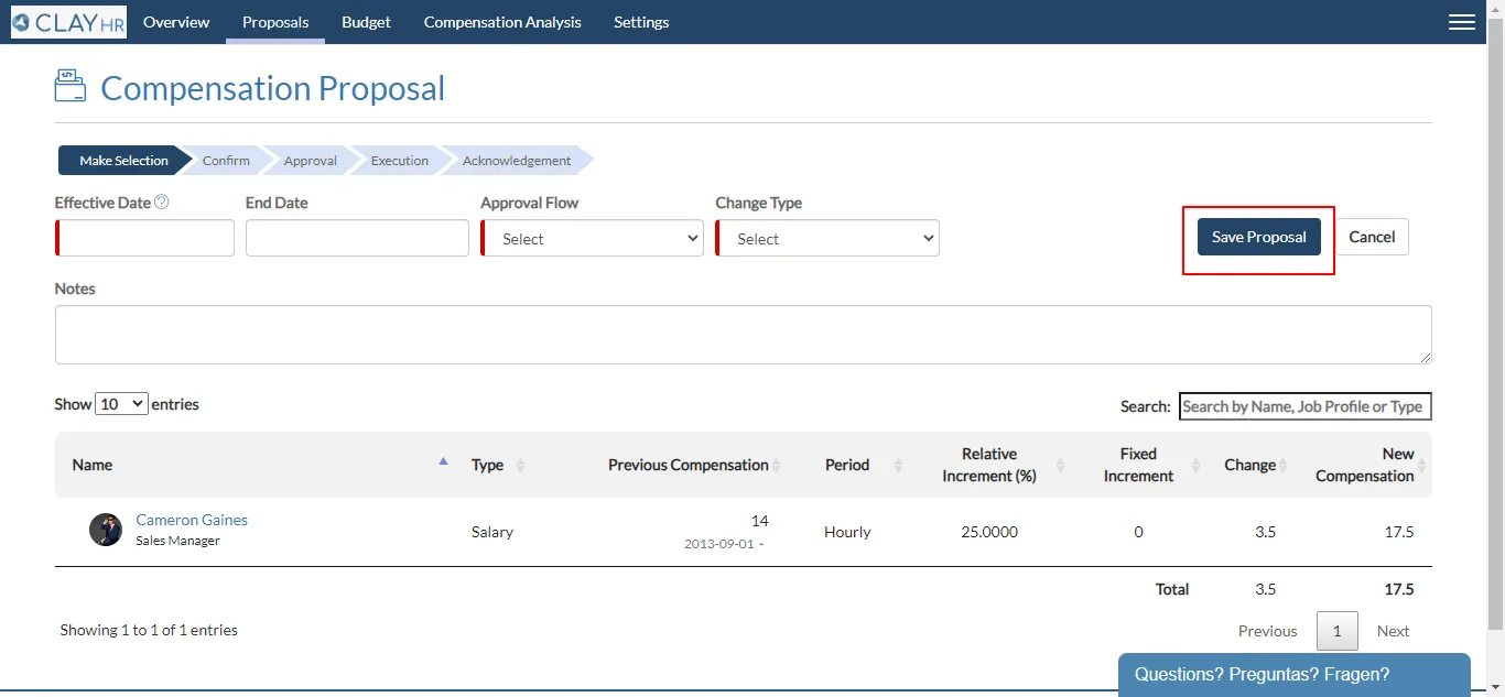 8. Select Effective Date, End Date (Optional), Approval Flow, and Change Type and click on Save Proposal.