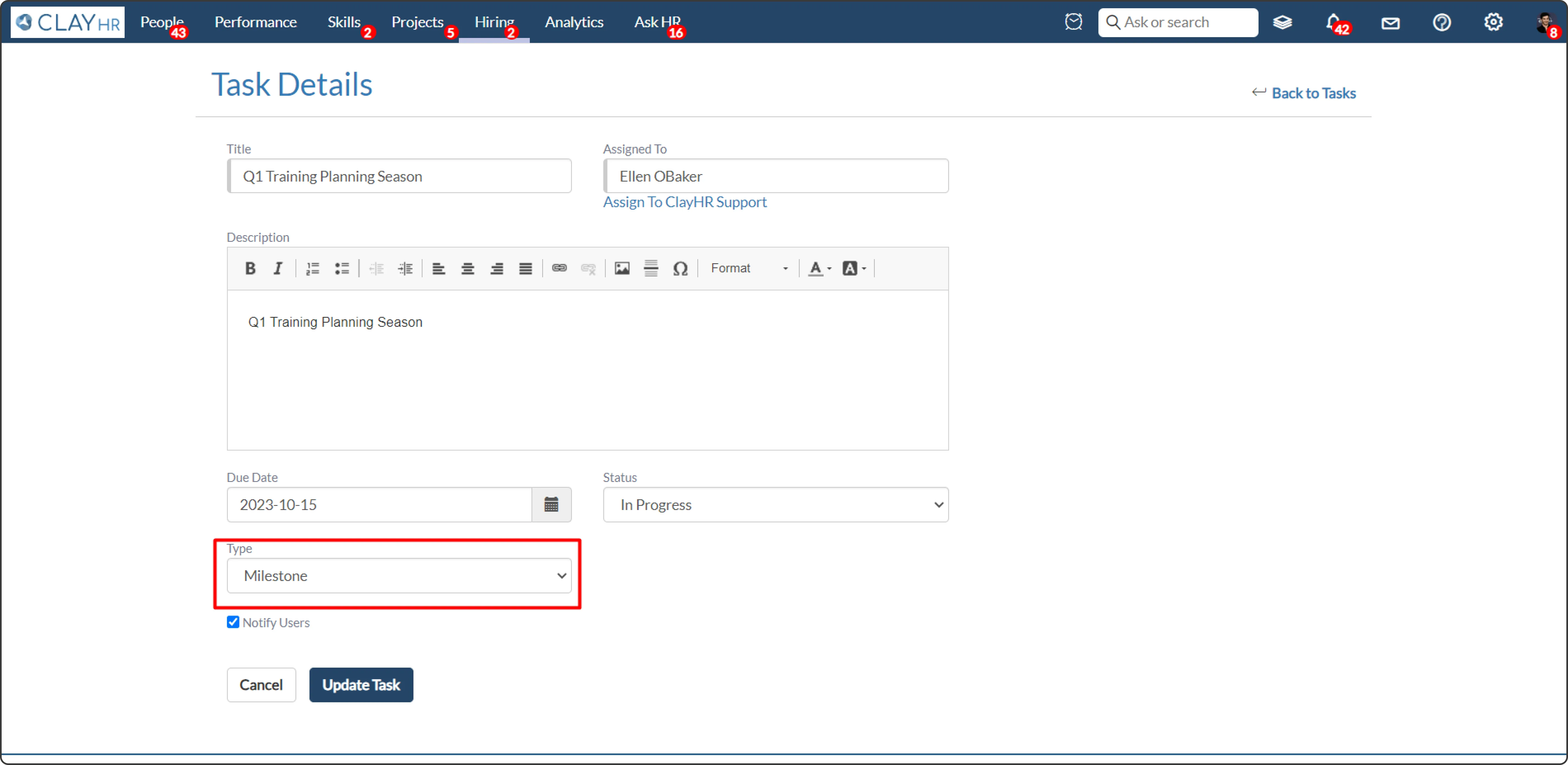 ClayHR provides you with robust task management capabilities to ensure a smooth and organized implementation process. This is designed to streamline and monitor the customer implementation process by creating or assigning tasks.