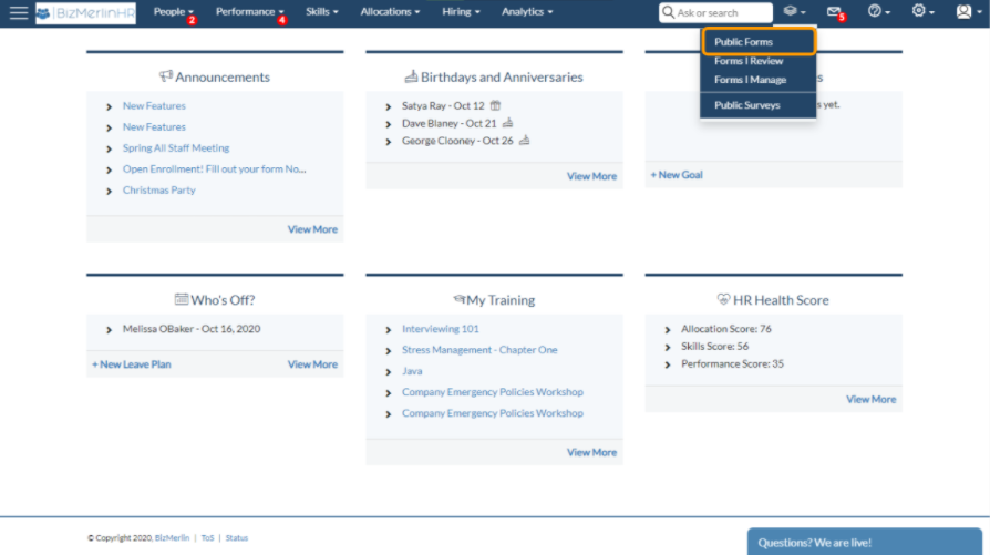 - To access ‘Open’ forms known as “Public” form, go to the “Forms” icon to the top right of the menu → “Public Form” sub-menu.