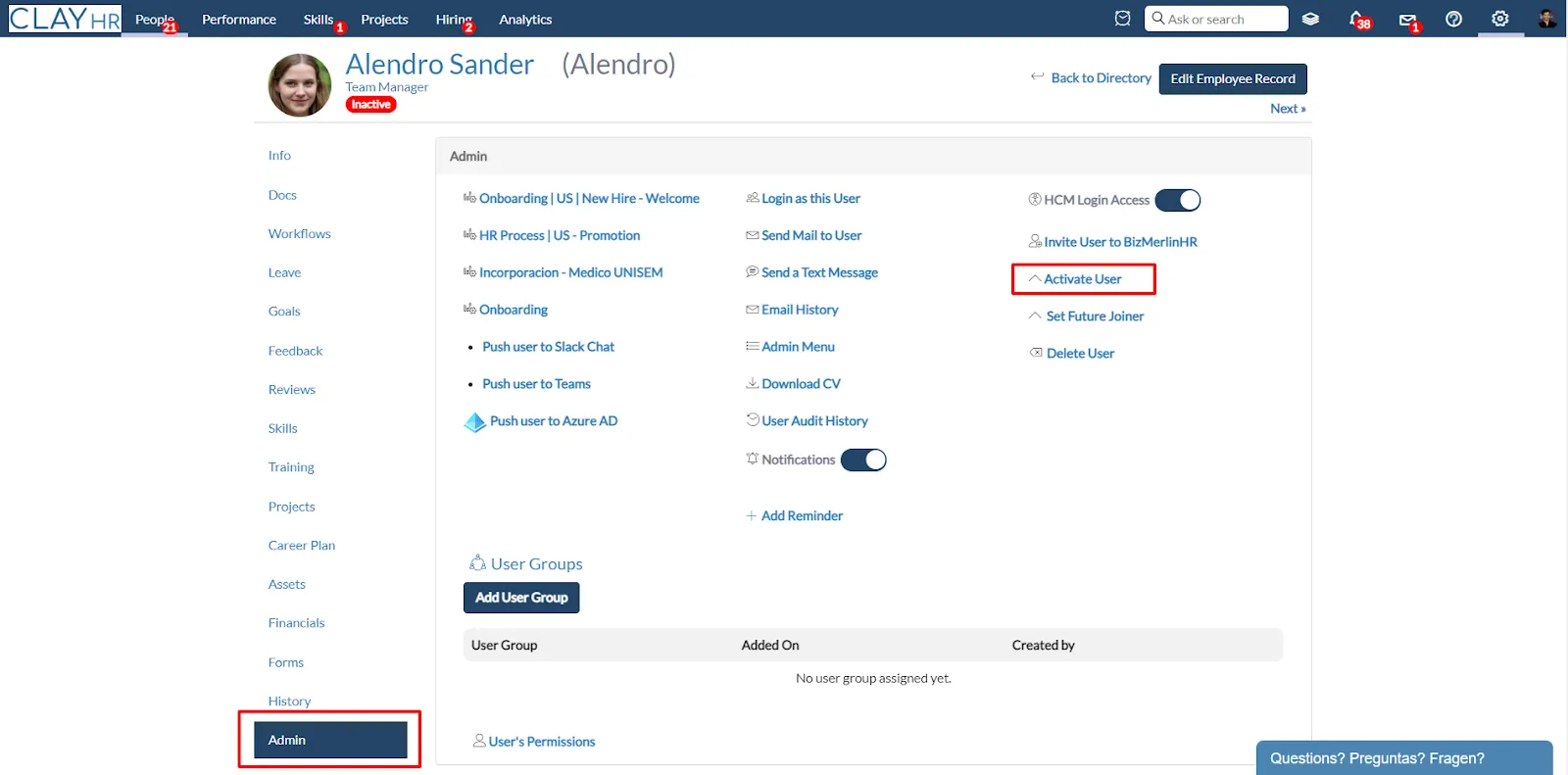 - Go to the “Admin” tab and click on the “Activate User” link to activate the user.