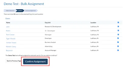 7. Select the users you want to assign the test to, and click on Confirm. The test will be assigned to all the selected users.
