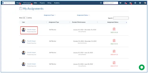 2. Click on the particular user name performance review, you want to complete. Only assignments assigned to you will be visible on this page.