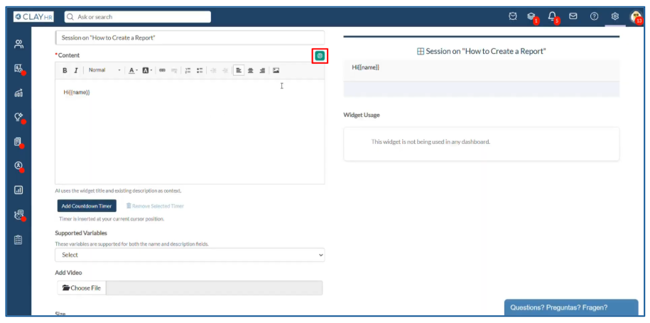 - You can also generate widget content using AI. Click the AI generate icon at the top-right corner of the Content section. Once generated, copy and paste the content into the text box