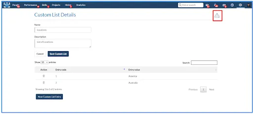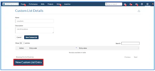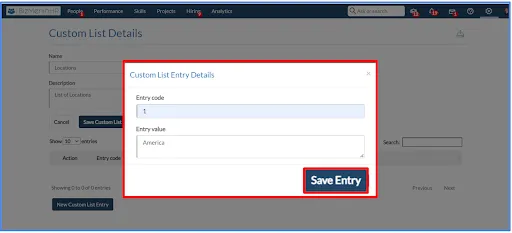 5. Click on “New Custom List Entry,” and fill in the required fields. For example, set the “Entry code” as “1” and the “Entry value” as “America”.