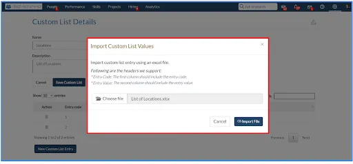 7. Select the excel file with the “Entry code” and Entry value” and click on the “Import File” button.