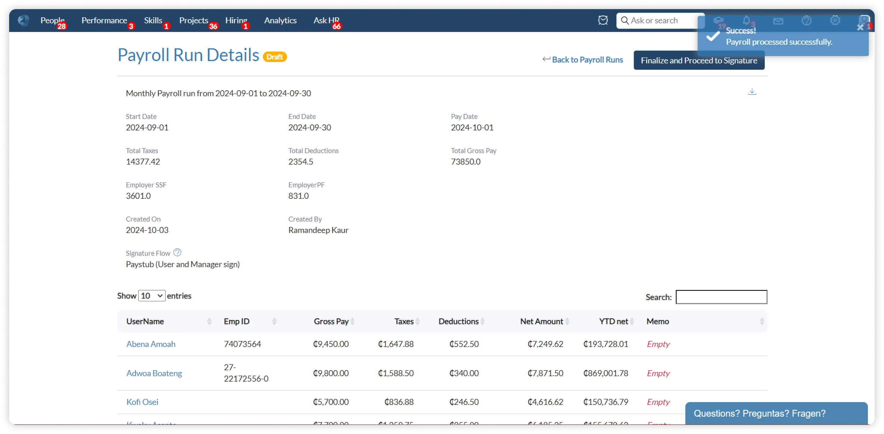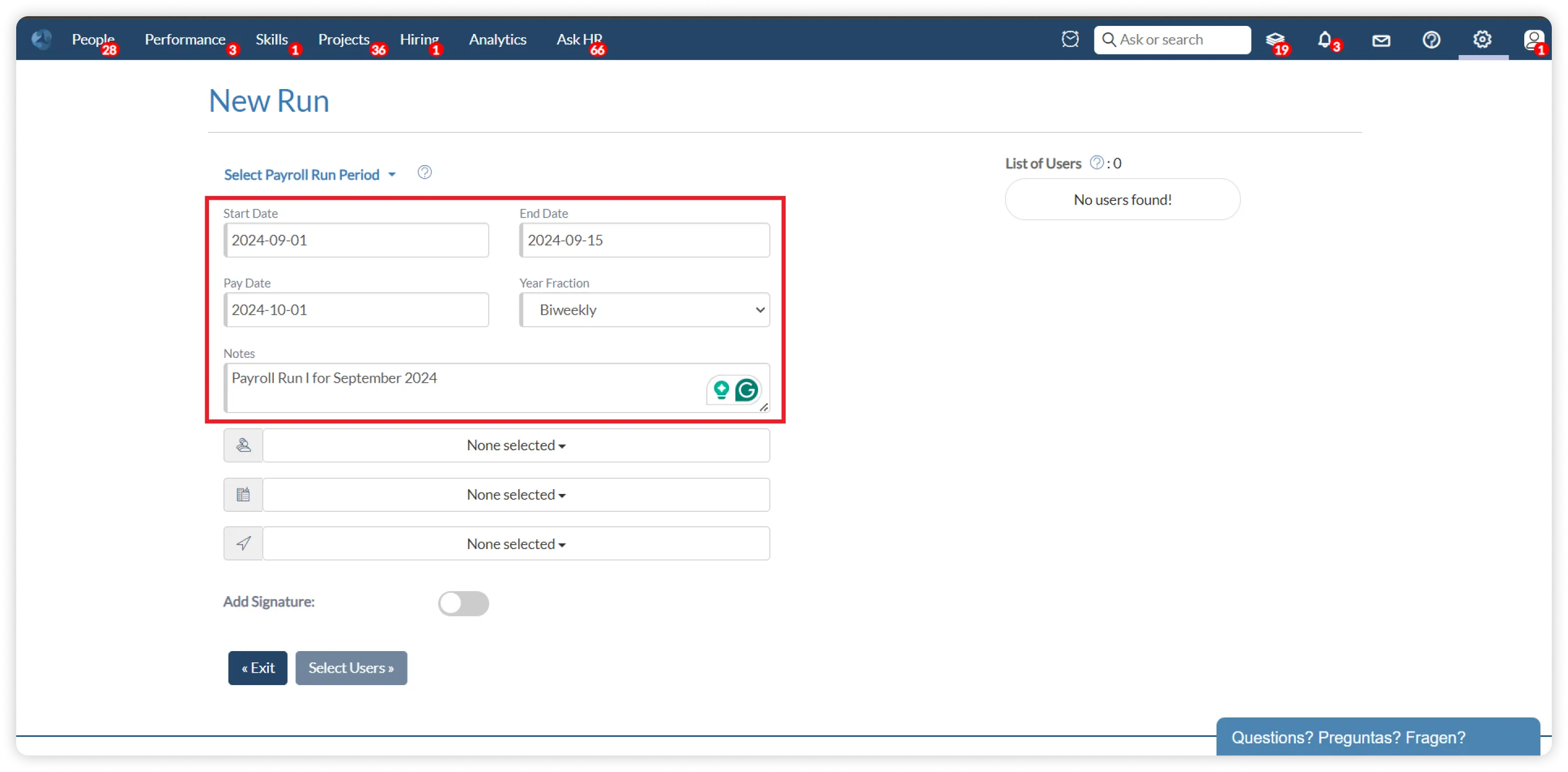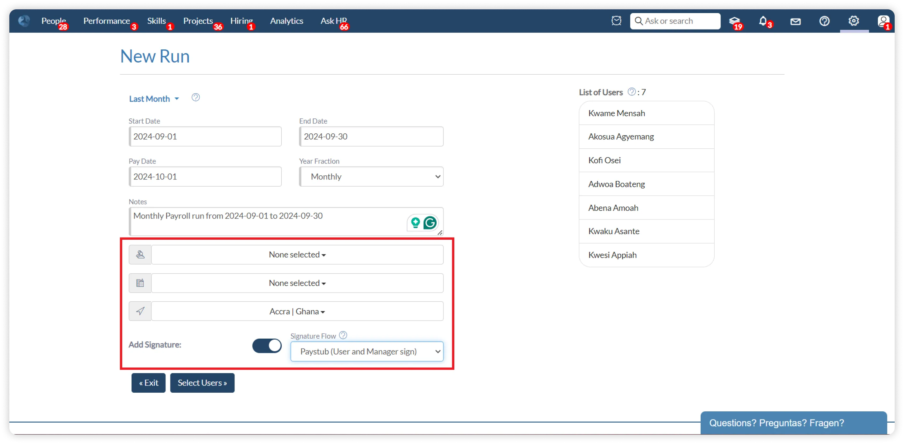 - Make User Selection based on Organizational Unit, Job Profile, and/or Location. You can add also Signature Flow to your Payroll Run.