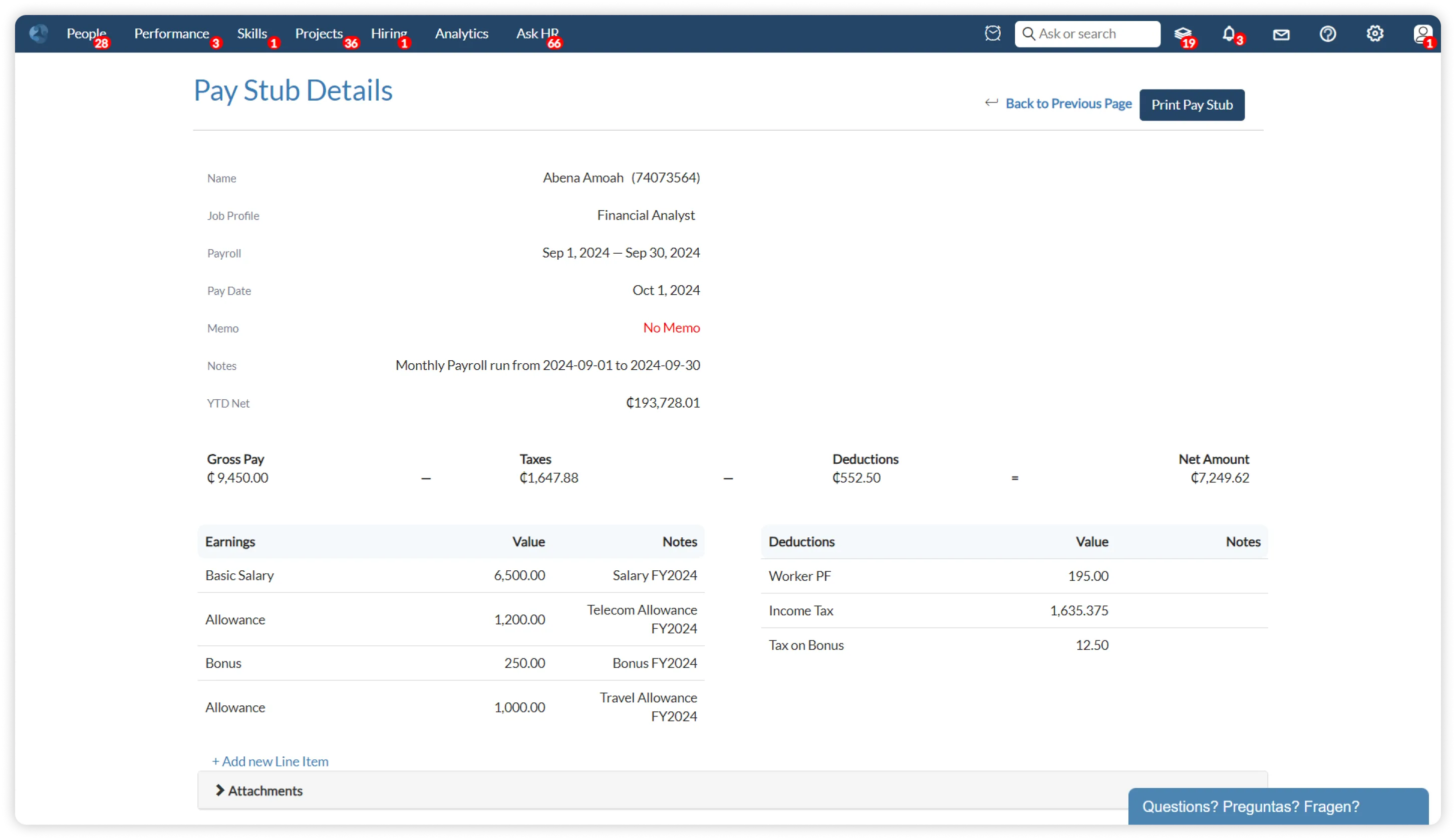 - The employee Pay Stubs display a detailed summary of the Earnings and Deductions earned by the employee in the Payroll.