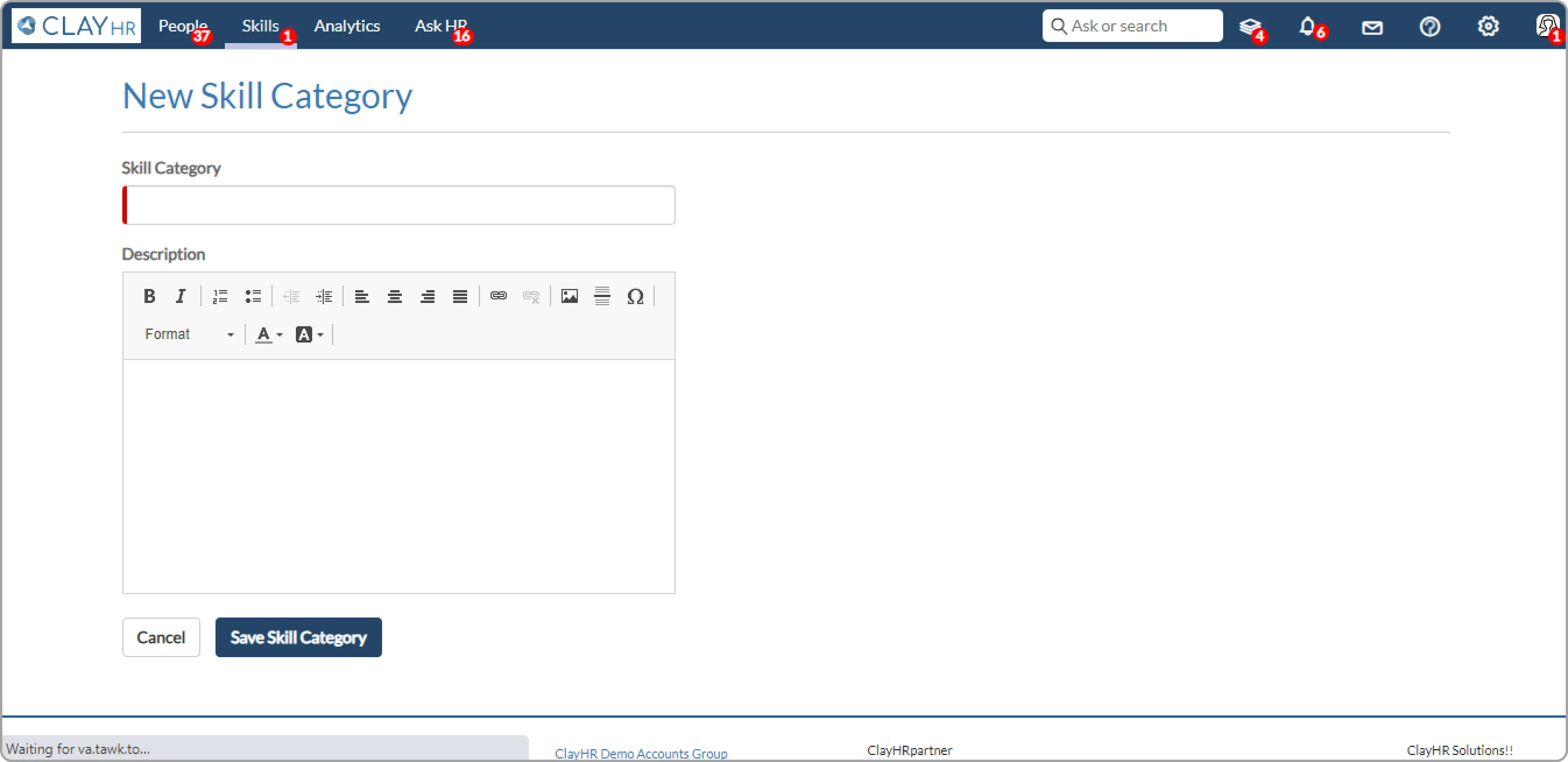 - Clicking on the “New Skill Category” button, you will be redirected to the new skill category page where you can fill in the necessary information required to create the skill category.
