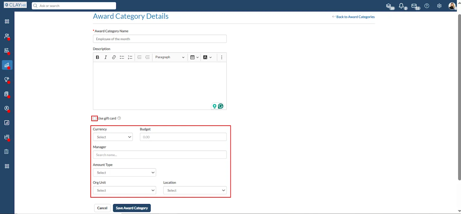 In ClayHR, you can create customized award categories to recognize and celebrate employee achievements. These categories can be configured with or without gift cards, depending on your organization's preferences.