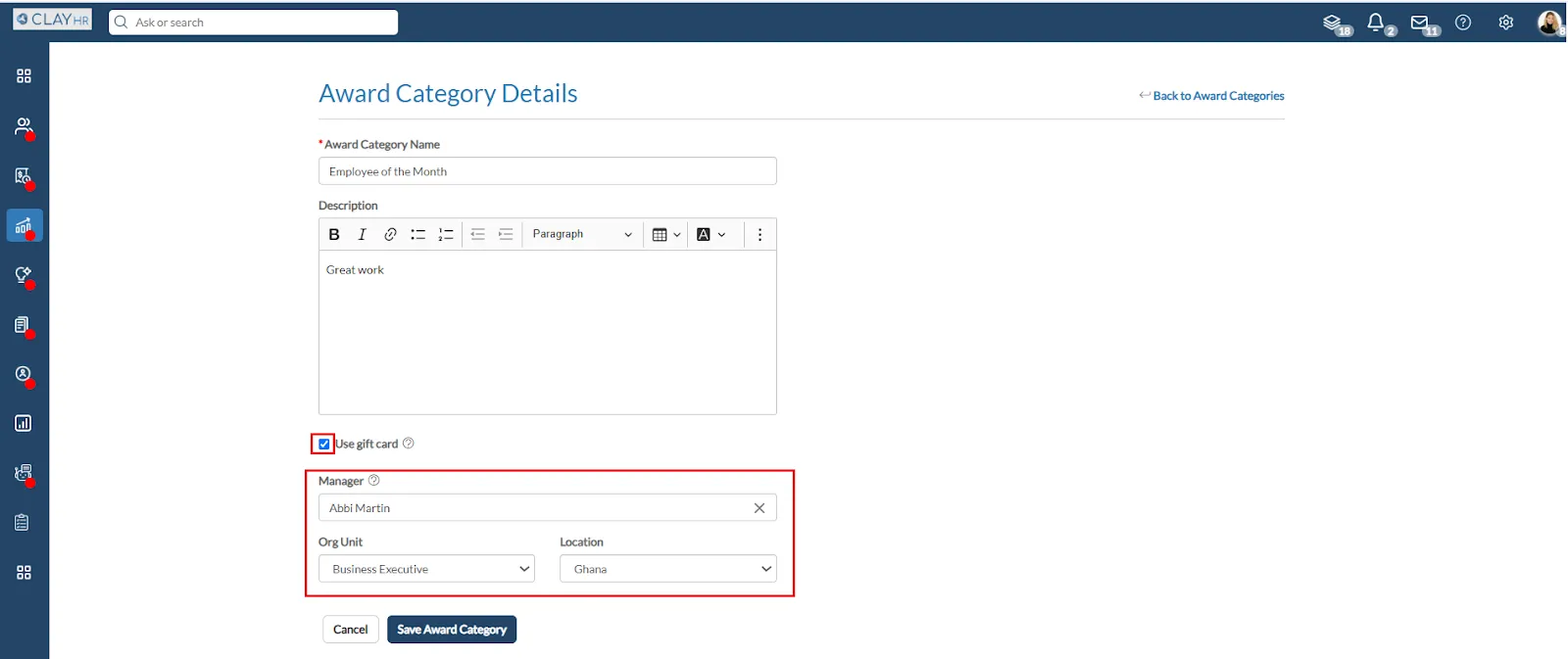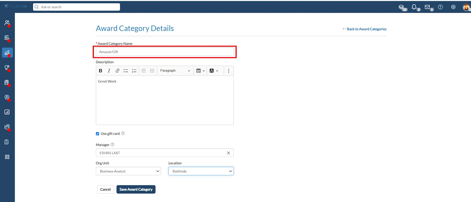 - To use a gift card, select the checkbox. You can create the Award Category for a specific Org unit and location.