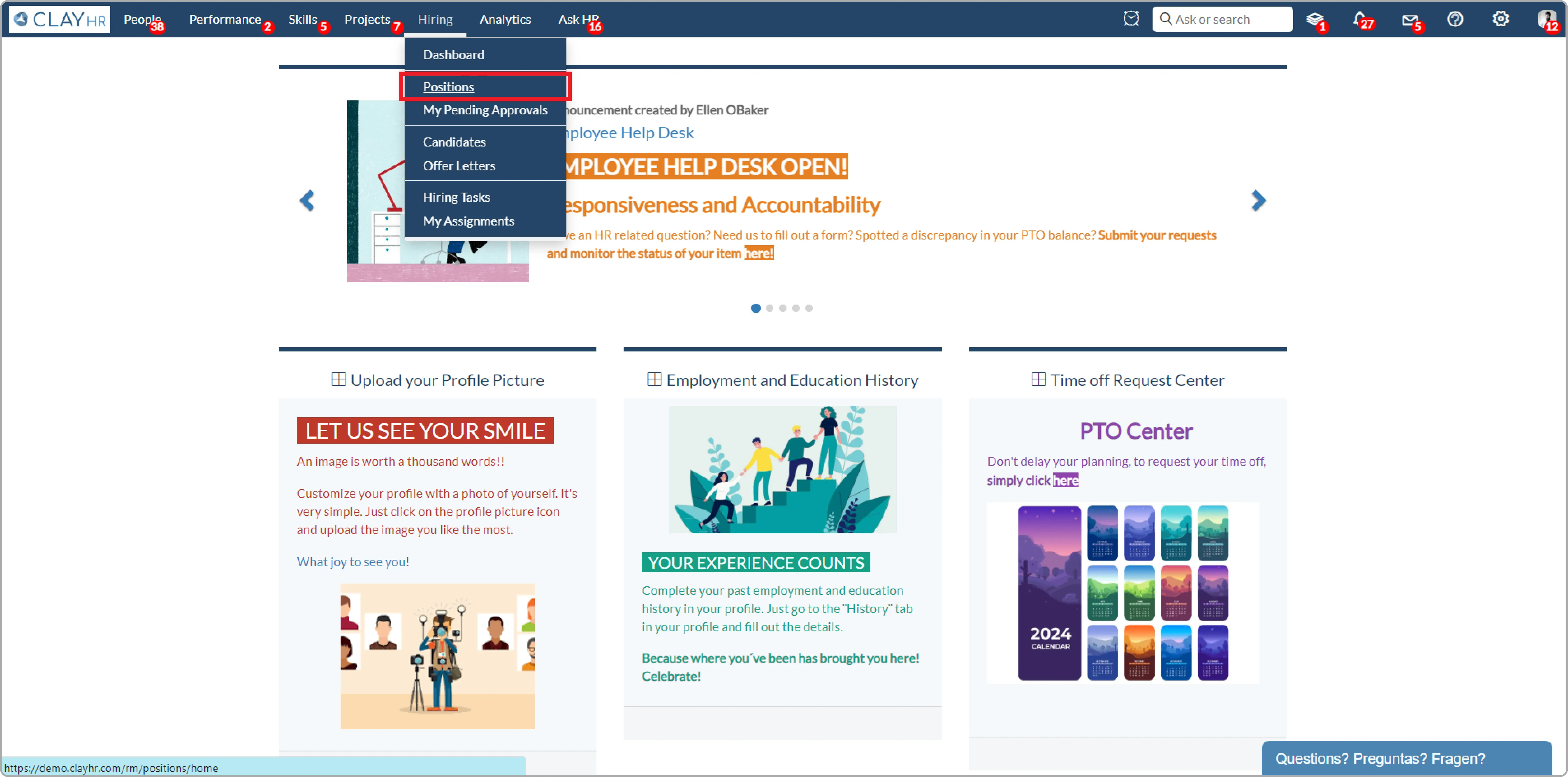 - Go to the “Hiring” menu in the navigation bar and click “Positions”.