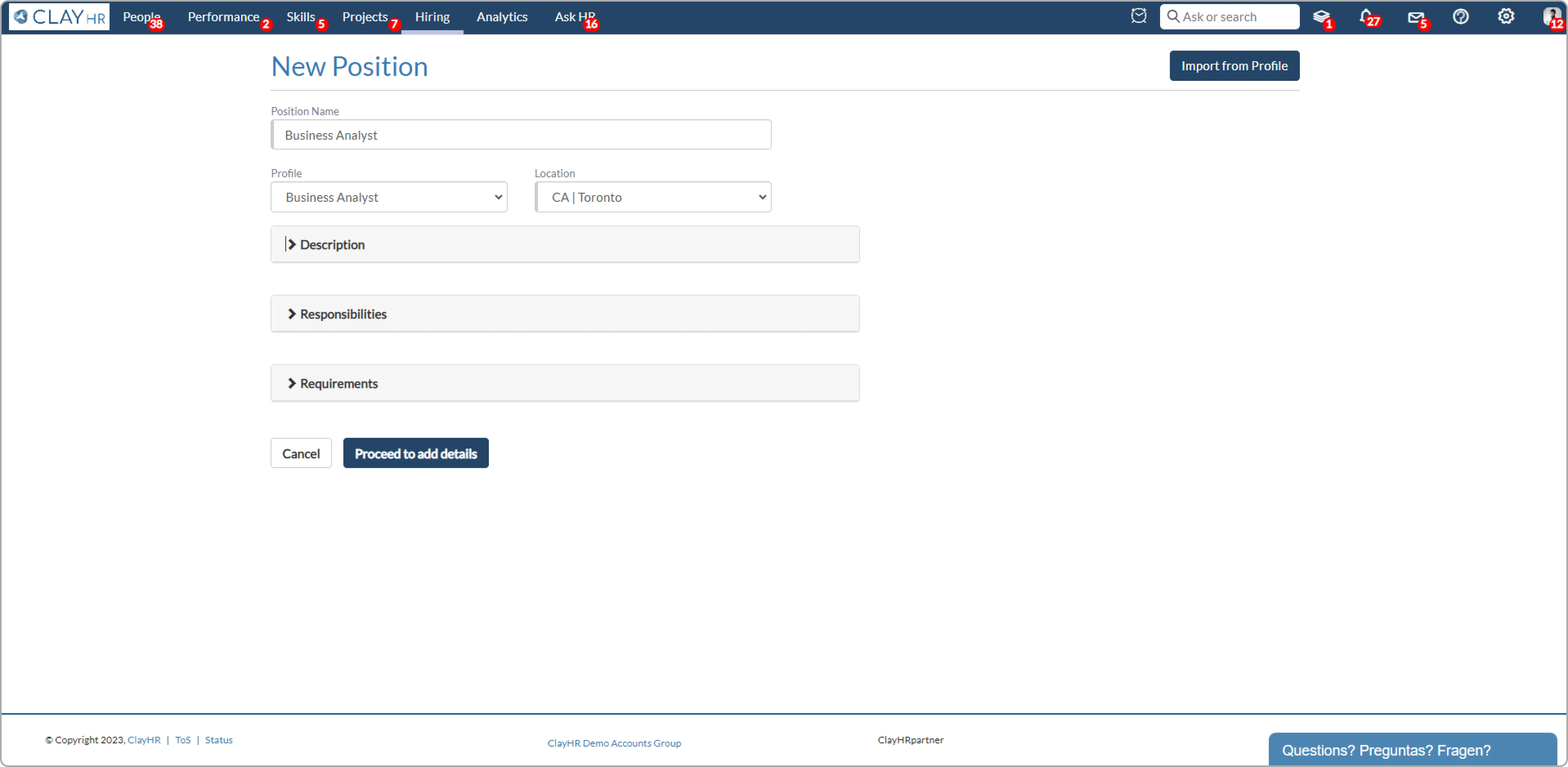 - The user can also fill in the position details by clicking on the “Import from Profile” button. It will fill in all the relevant field details related to the Job Profile selected and then click on “Proceed to add details”.