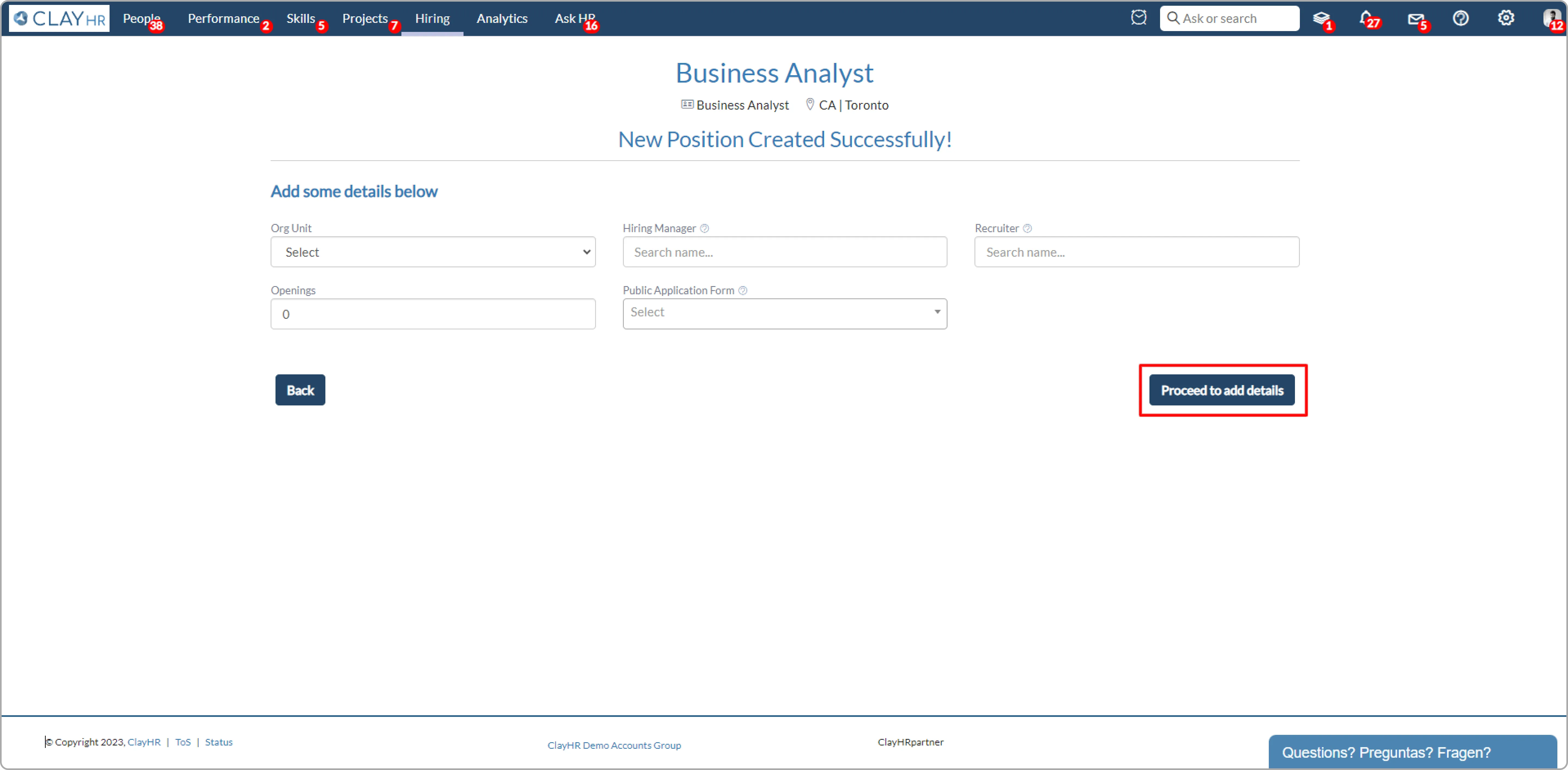 - Clicking on the “Proceed to add details” will create a position. The user can also fill in the other details like Hiring Manager, Recruiter, etc.