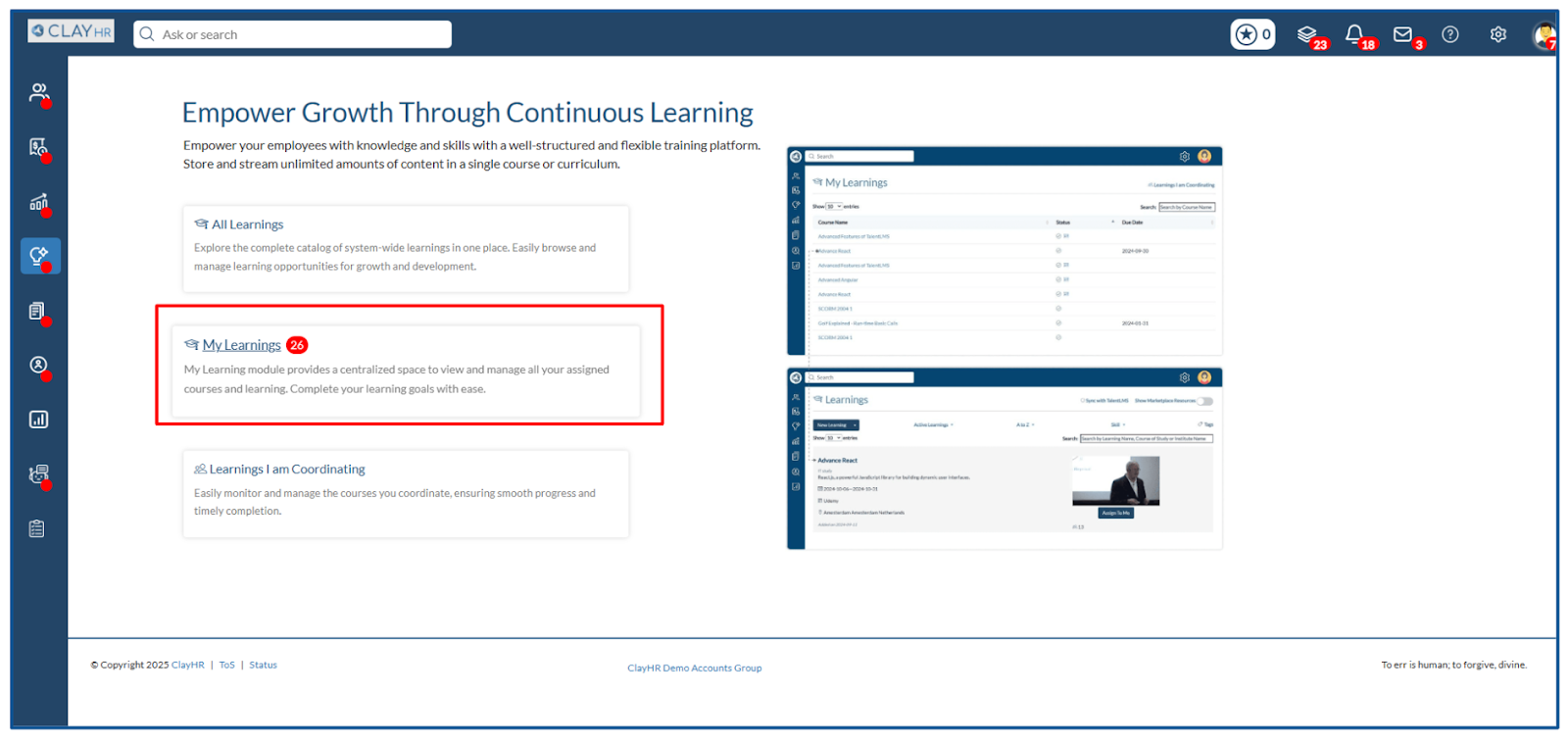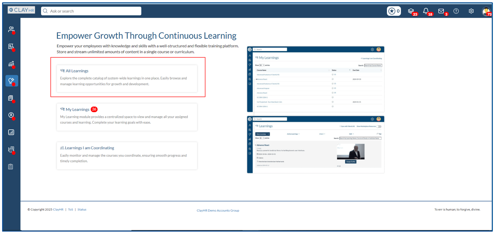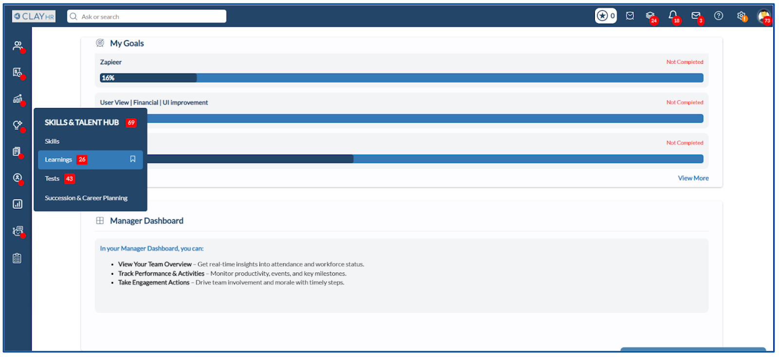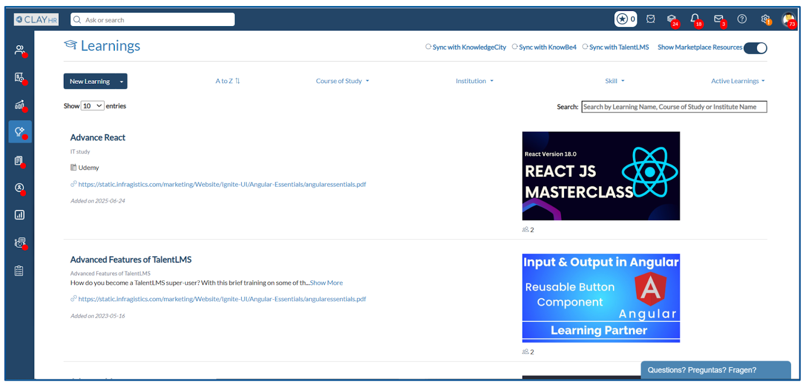 1. From the left-hand menu, select Skills and Talent Hub, then click Learnings to open the learnings landing page.