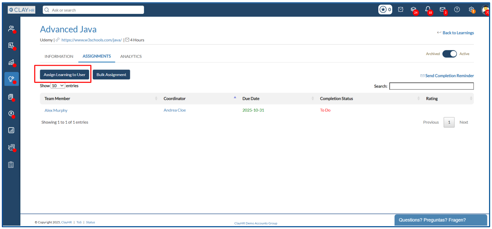 7. Next, to view how the quiz appears during a learning attempt, assign the learning to a user from the Assignments section by clicking the Assign Learning to User button.