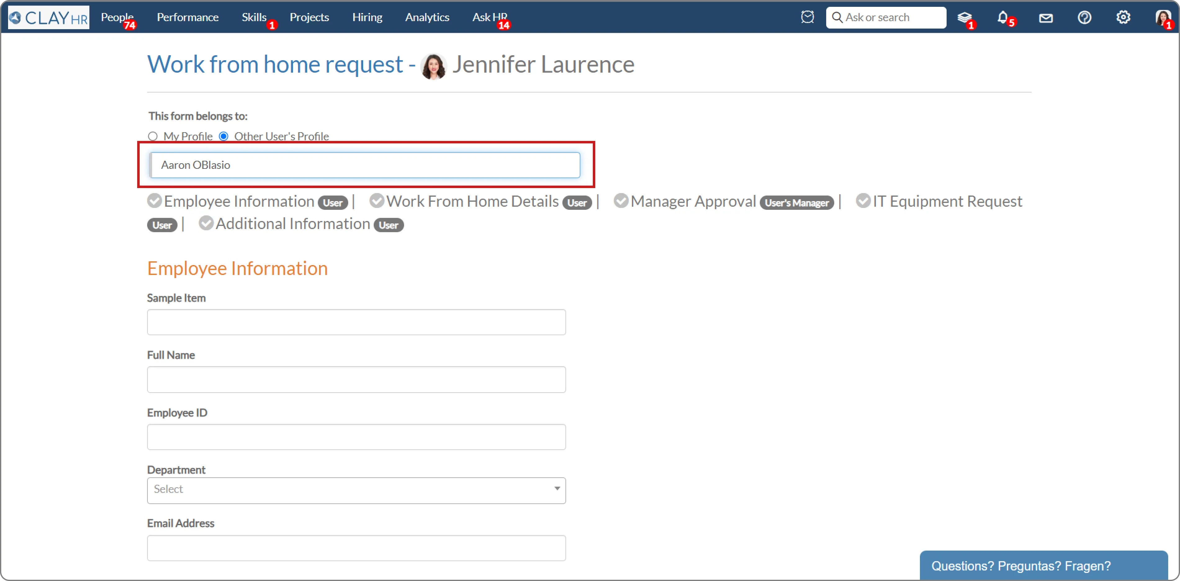 - To fill in on behalf of another person, select the option “Other User’s Profile” and select the user from lookup.