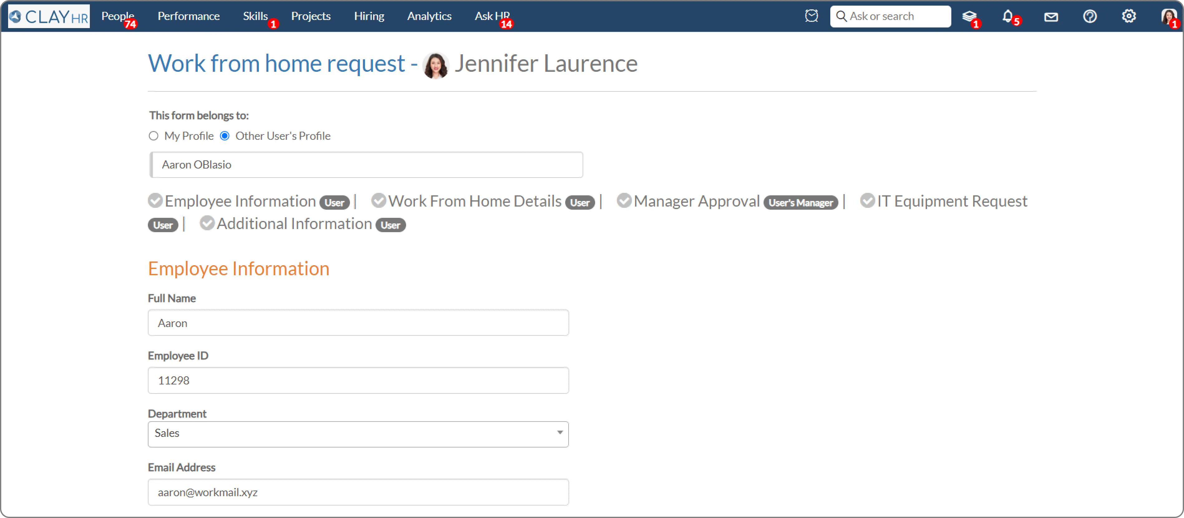 ClayHR Forms offers a feature that enables users to fill out forms on behalf of another user. The feature is for public forms only, ensuring that sensitive or private information remains secure. Only the people with permission are allowed to fill out the form on behalf of another user.