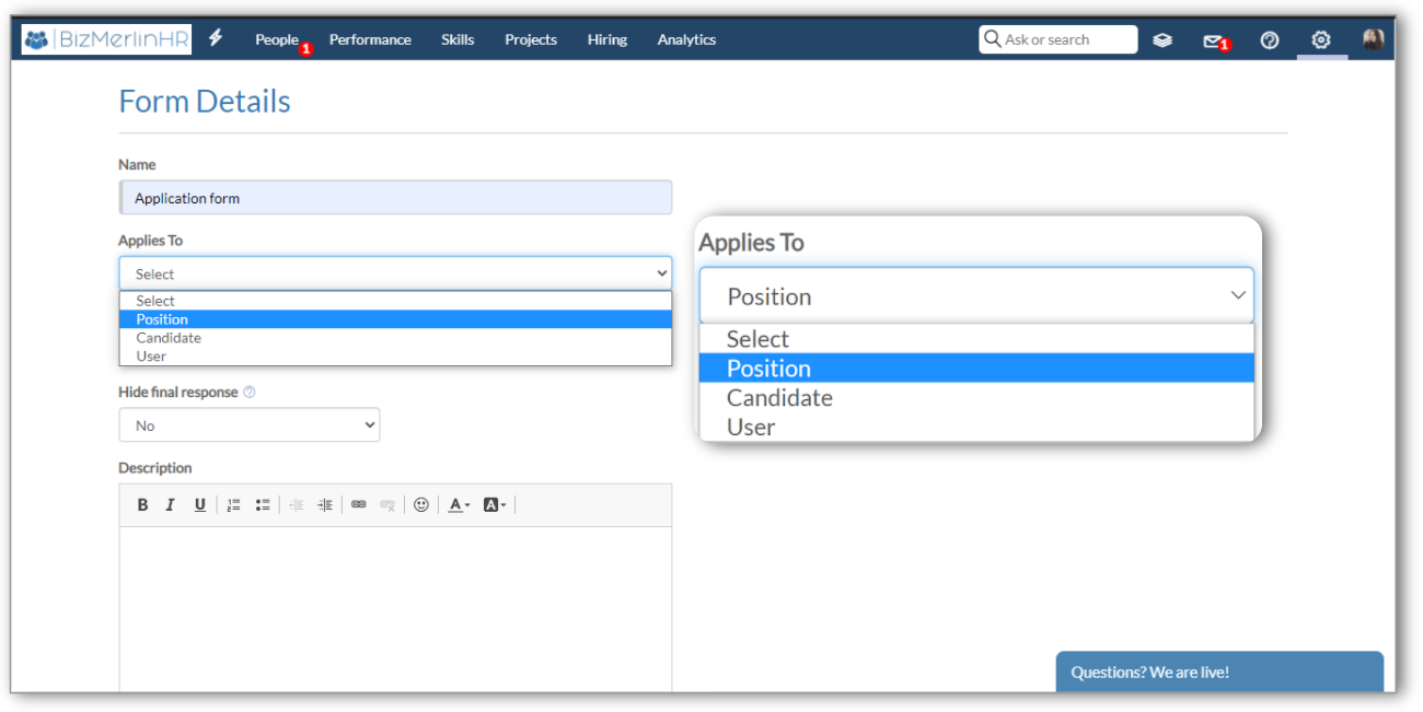 - While creating a form that is designed to obtain additional information from a candidate during the application process, please select “Position” from the “Applies To” dropdown menu. This action maps a form to positions.