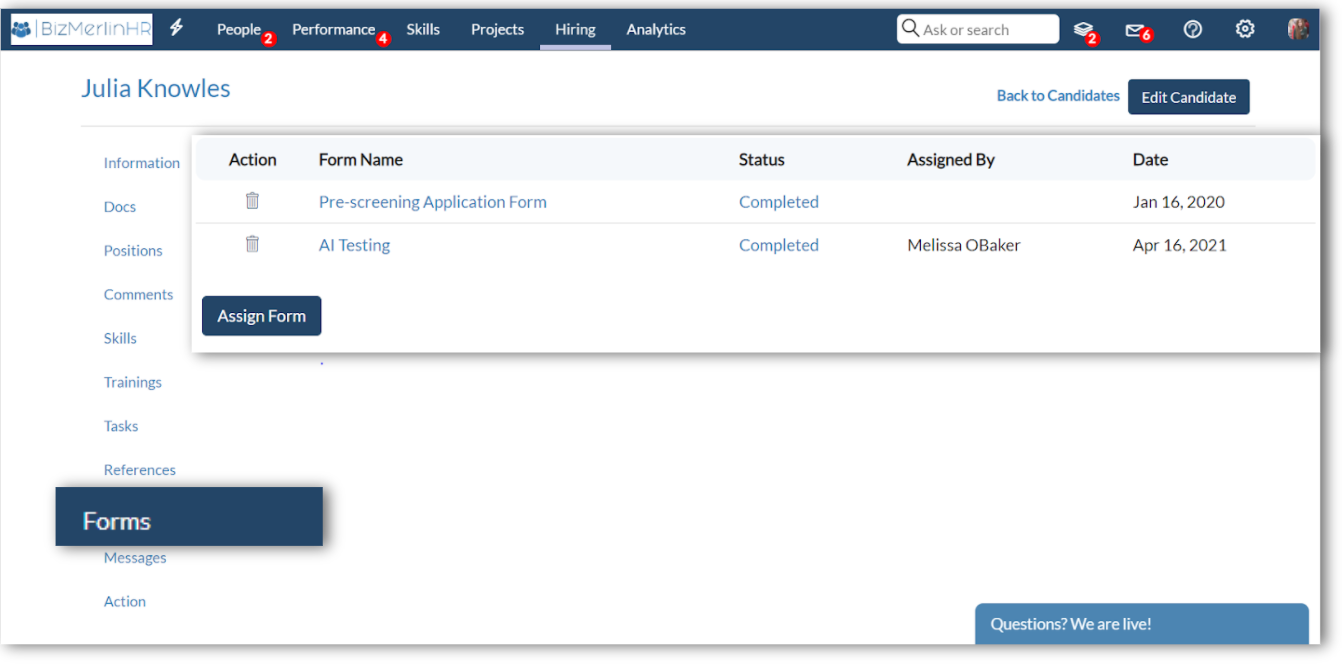 - The applicant's response to the forms can be found in the forms tab of the candidate's profile.