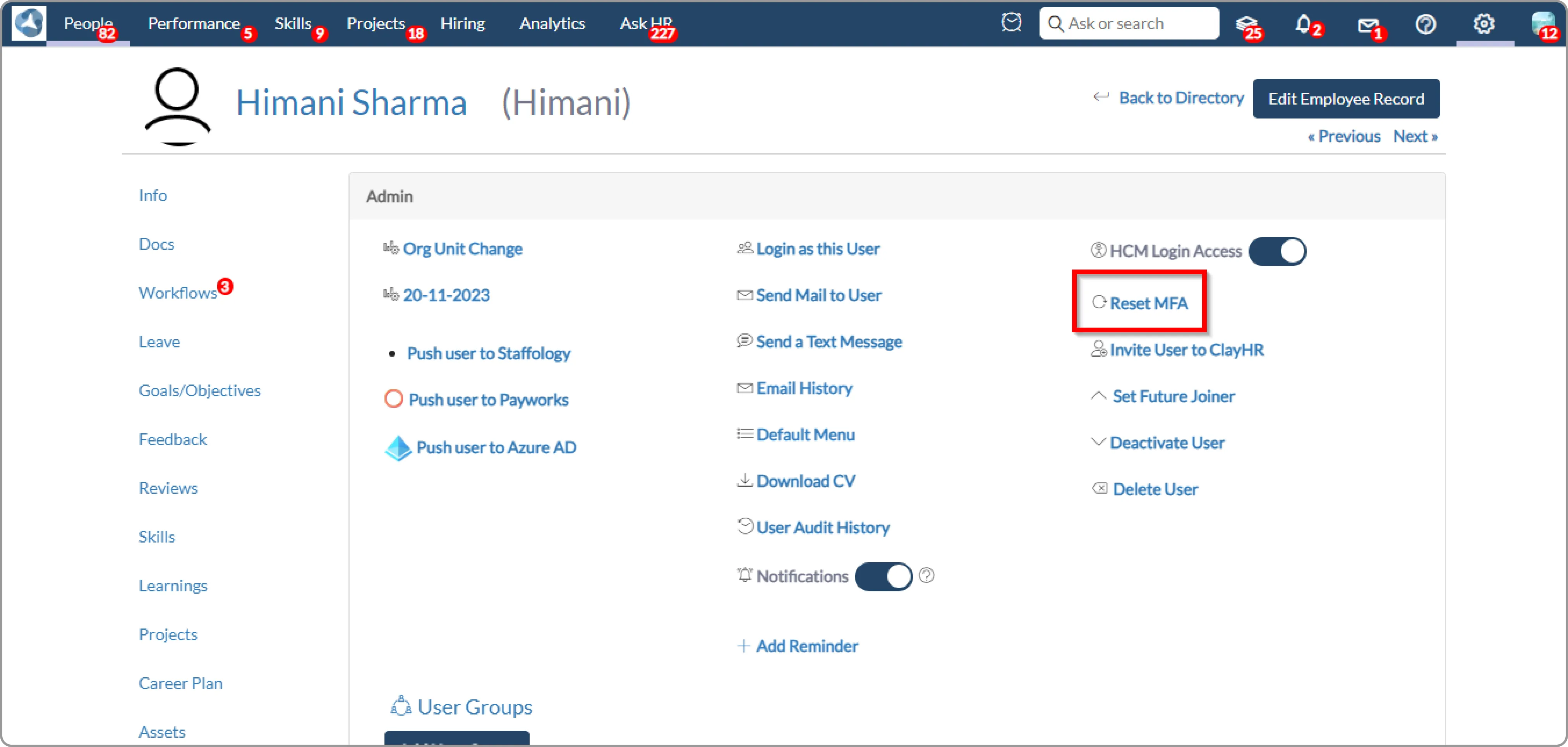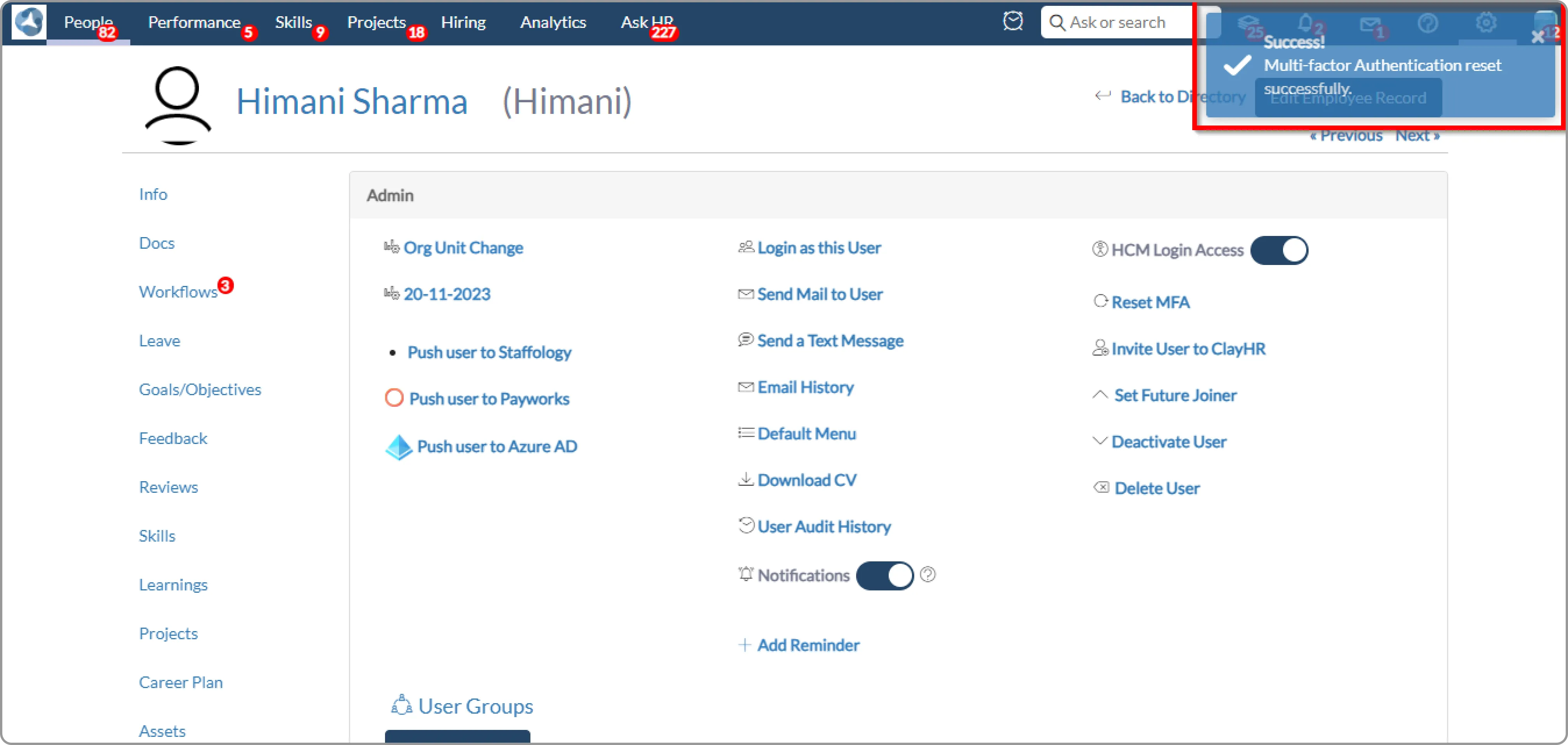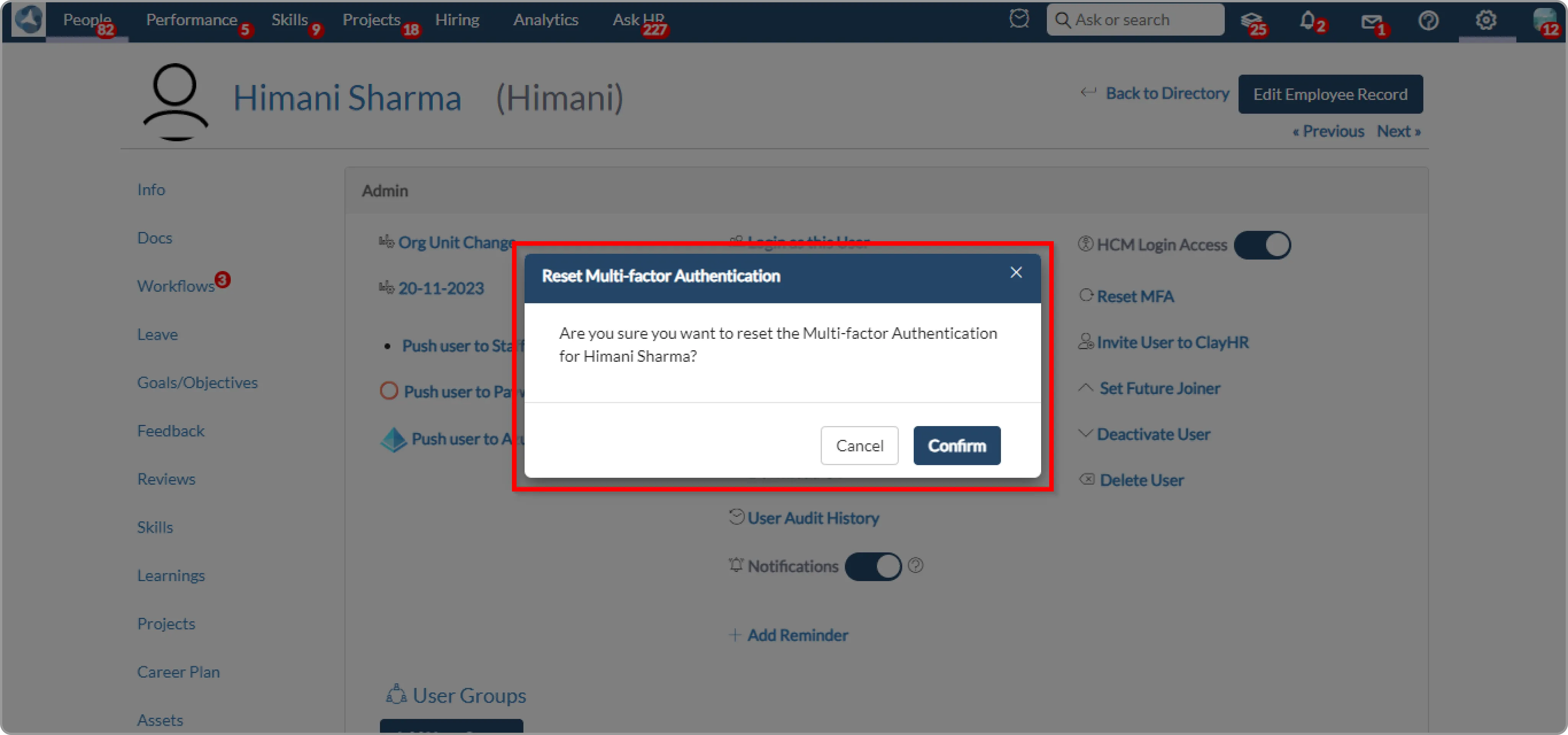 - By clicking on the confirm button the user's MFA is reset. Now, users can log in to their account with their username and password.