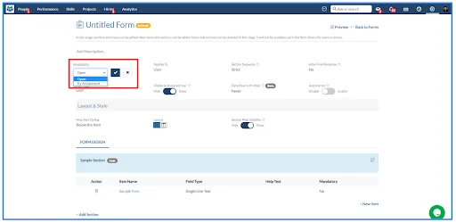 - Select availability of the form as “Open’’ to make the form public, which means available to all, or as “By Assignment’’ to make it available to assigned users or candidates.