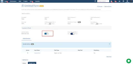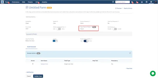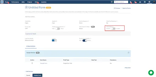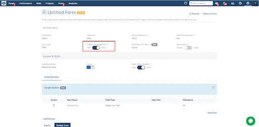 - Note: By keeping the toggle to the ‘Hide’ option, the form will not reflect on the employee record of the assigned user and the assigned user will not receive any email notification for the same.