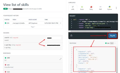 For e.g : To get the skills list navigate to the skills link from left panel and fill the User Id and API Key which you retrieved from your application