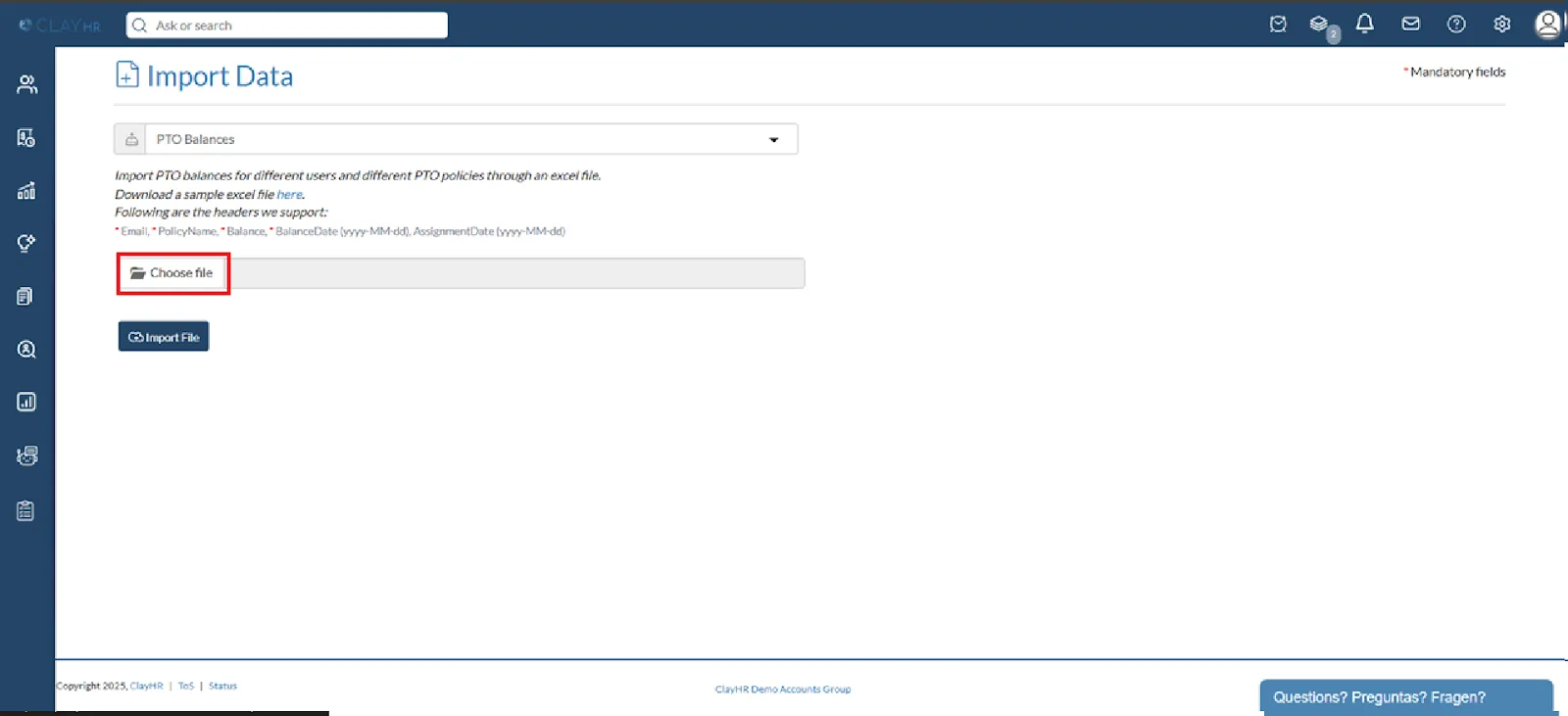 ClayHR allows you to import PTO balances through an Excel file (download a sample file here).