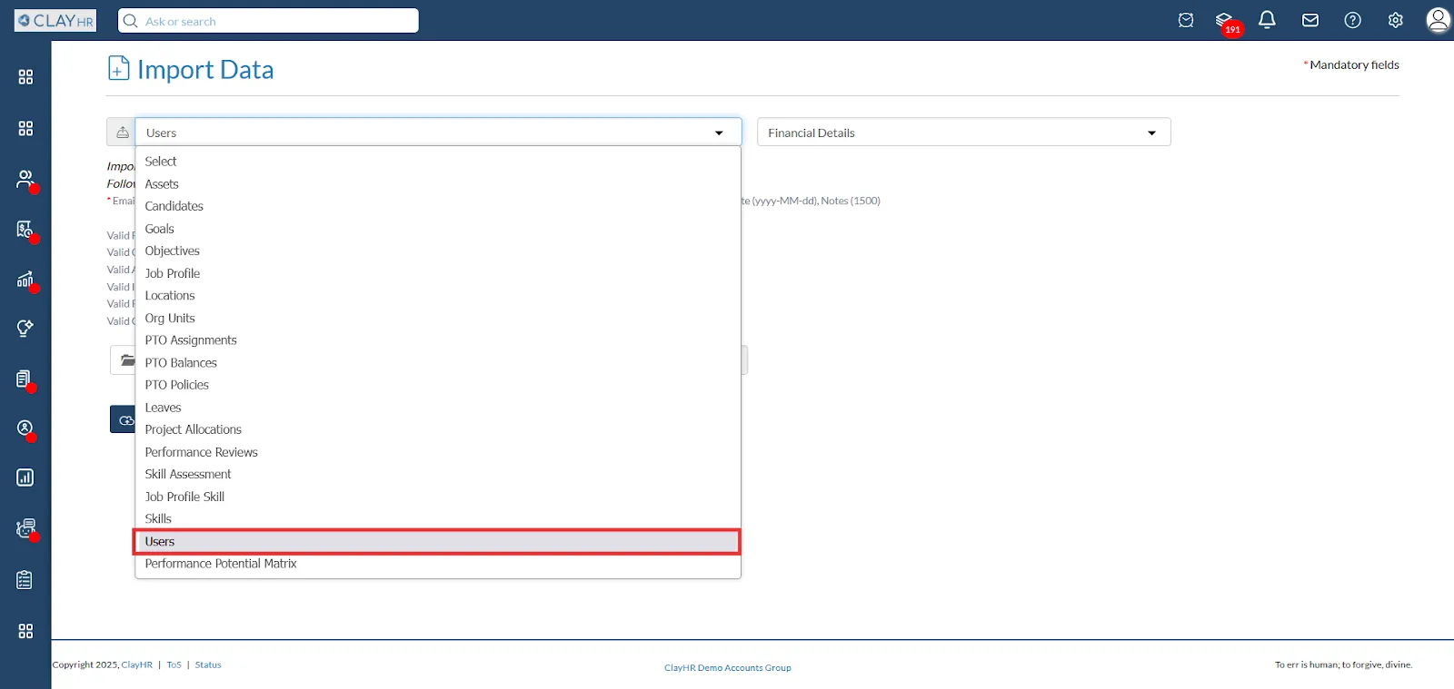 - In the drop-down associated with ‘Users’, select ‘Financial Details’ to specify the type of data to import.