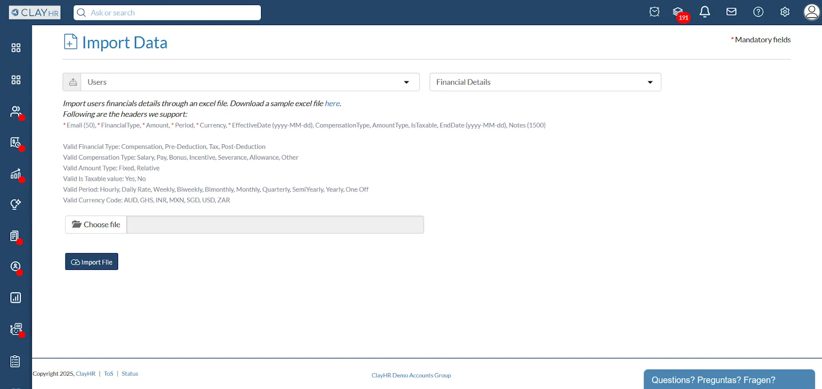 ClayHR facilitates the bulk import of financials of users via an Excel file, allowing you to import multiple financials at once by including key parameters such as Financial Type, Amount, Email, Period, Currency, Effective Date, Compensation Type, Amount Type, IsTaxable, End Date, and Notes.