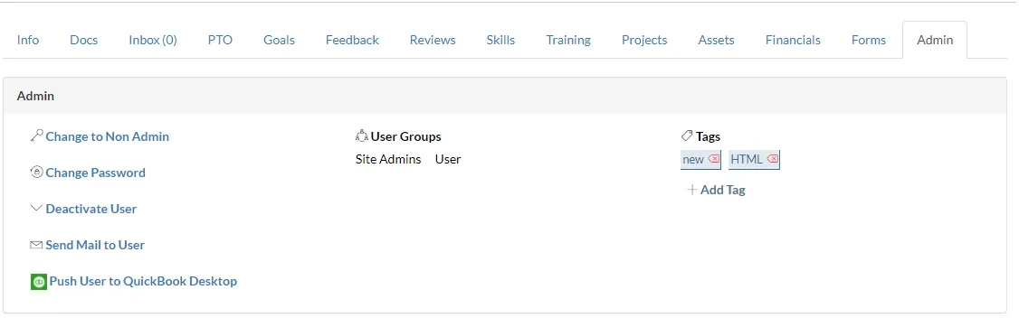 - On the User Profile page under the Admin tab, click on Push User to QuickBooks Desktop link.