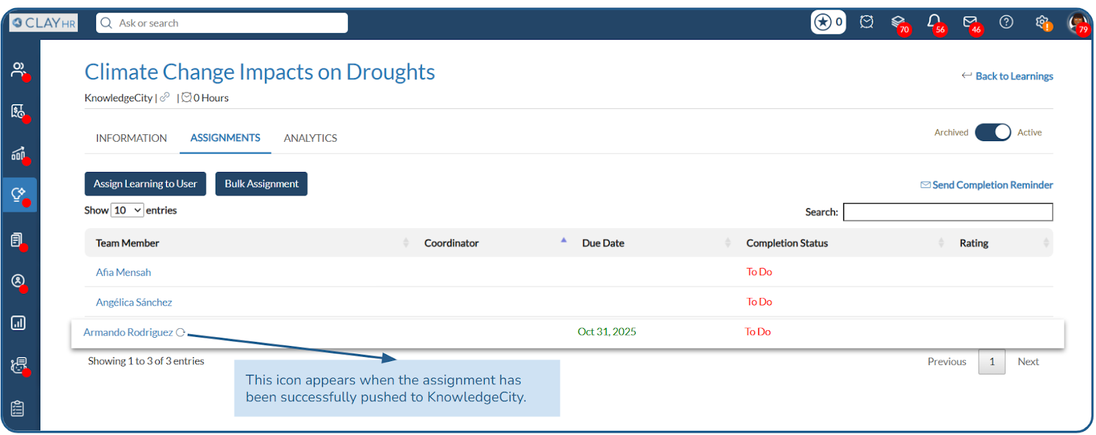 - Learning Assignment Synchronization (Push): Effortlessly push learning assignments created in ClayHR into KnowledgeCity, enabling employees to access assigned courses and training without manual intervention.