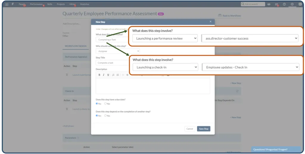 a. Select “launching a performance review” or “Launching a check-in” as a step and select the respective template from the corresponding drop-down field.