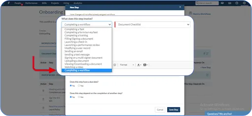 5. As a step choose ‘Completing a Workflow’ and from the list alongside, select the particular workflow.